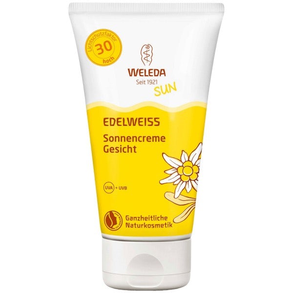 Die Weleda Sonnenschutz-Linie Edelweiss ist ein echter Klassiker unter den Sonnencremes. Es gibt sie als Sensitiv Edition für Babys und Kids, aber auch für Erwachsene als Sonnencreme fürs Gesicht oder als Sonnenmilch für den Körper mit Lichtschutzfaktor 30 oder 50. Weleda arbeitet mit mineralischen Filtern, die Creme ist extra wasserfest und besonders feuchtigkeitsspendend dank Inhaltsstoffen wie Sonnenblumenöl und Edelweiß.