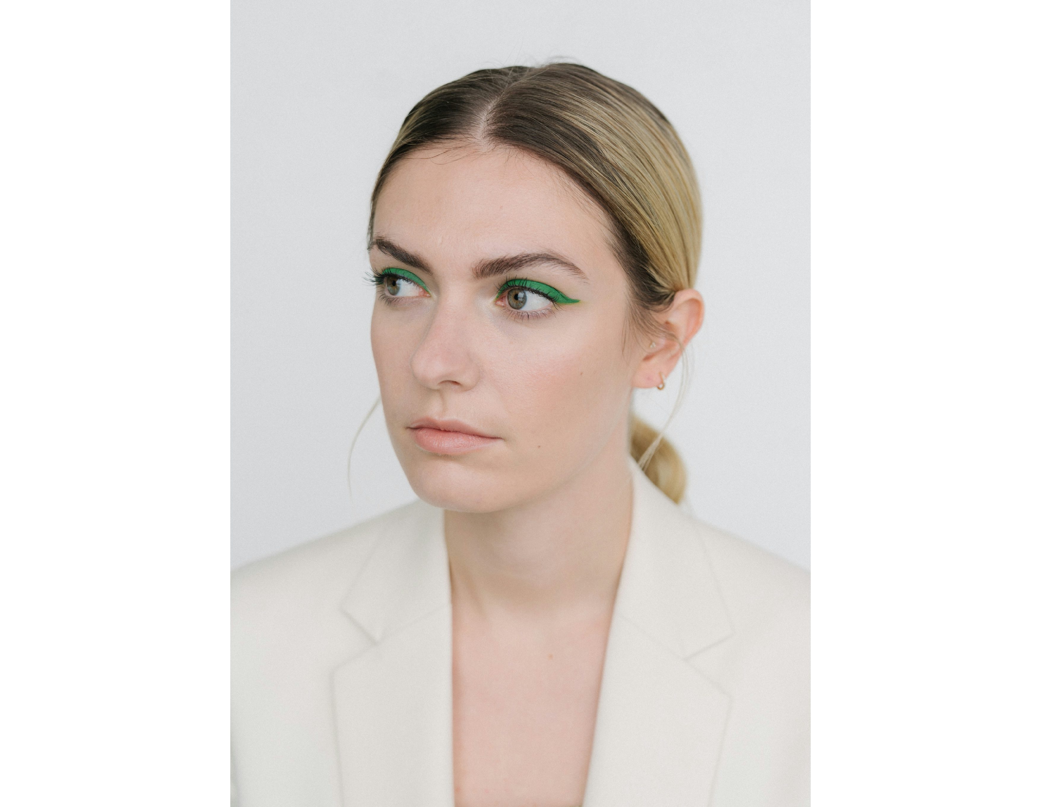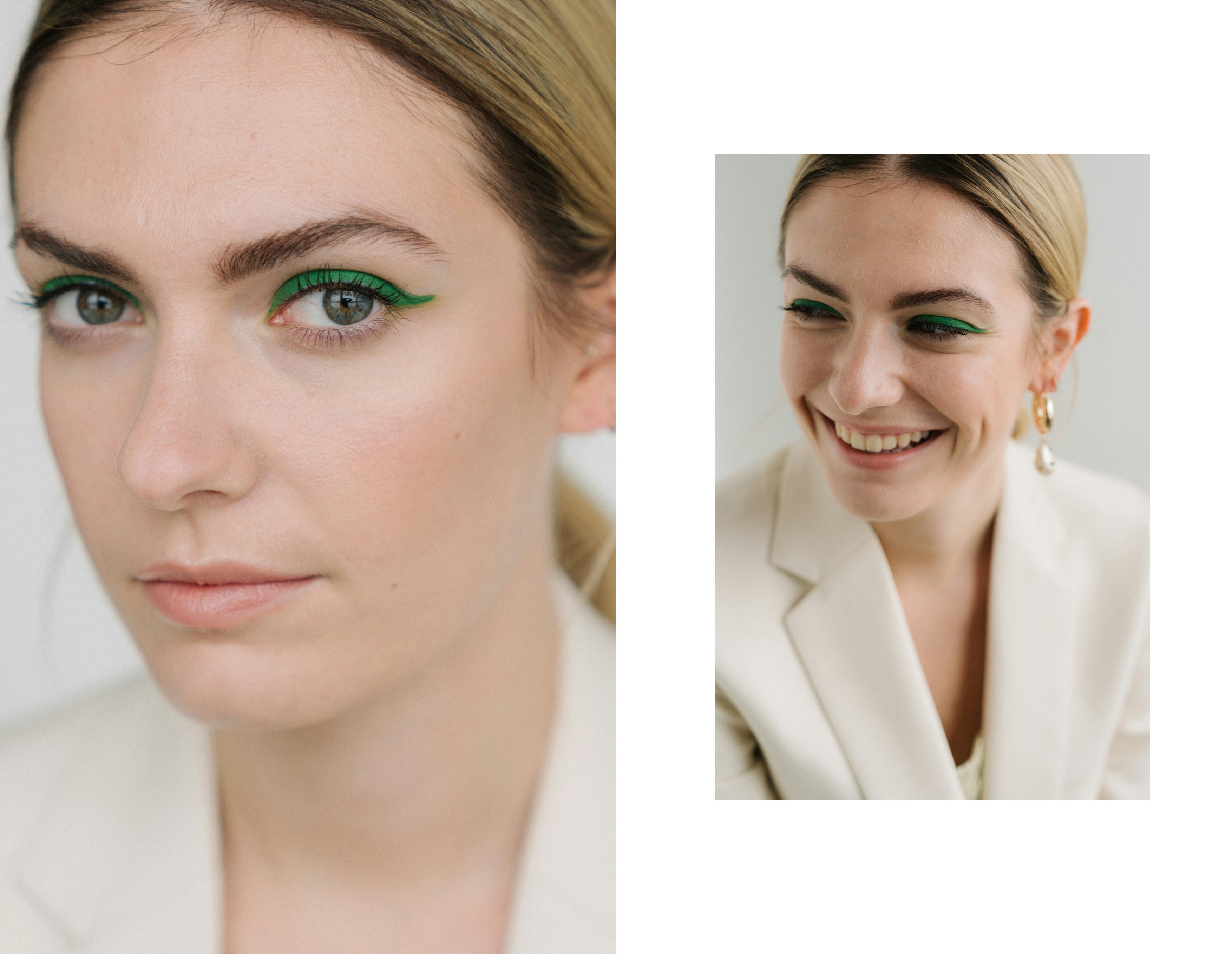 Niemals hätte ich gedacht, dass grüner Eyeliner so elegant und erwachsen aussieht. Mit grünem Lidschatten experimentiere ich schon lange herum, aber an den monochromen, grafischen Look habe ich mich noch nie herangewagt – und bereue es jetzt. Für das markante Make-up zeichnet ihr einen ganz normalen Cateye-Liner, nur etwas breiter. Gar nicht mal so schwer, oder?