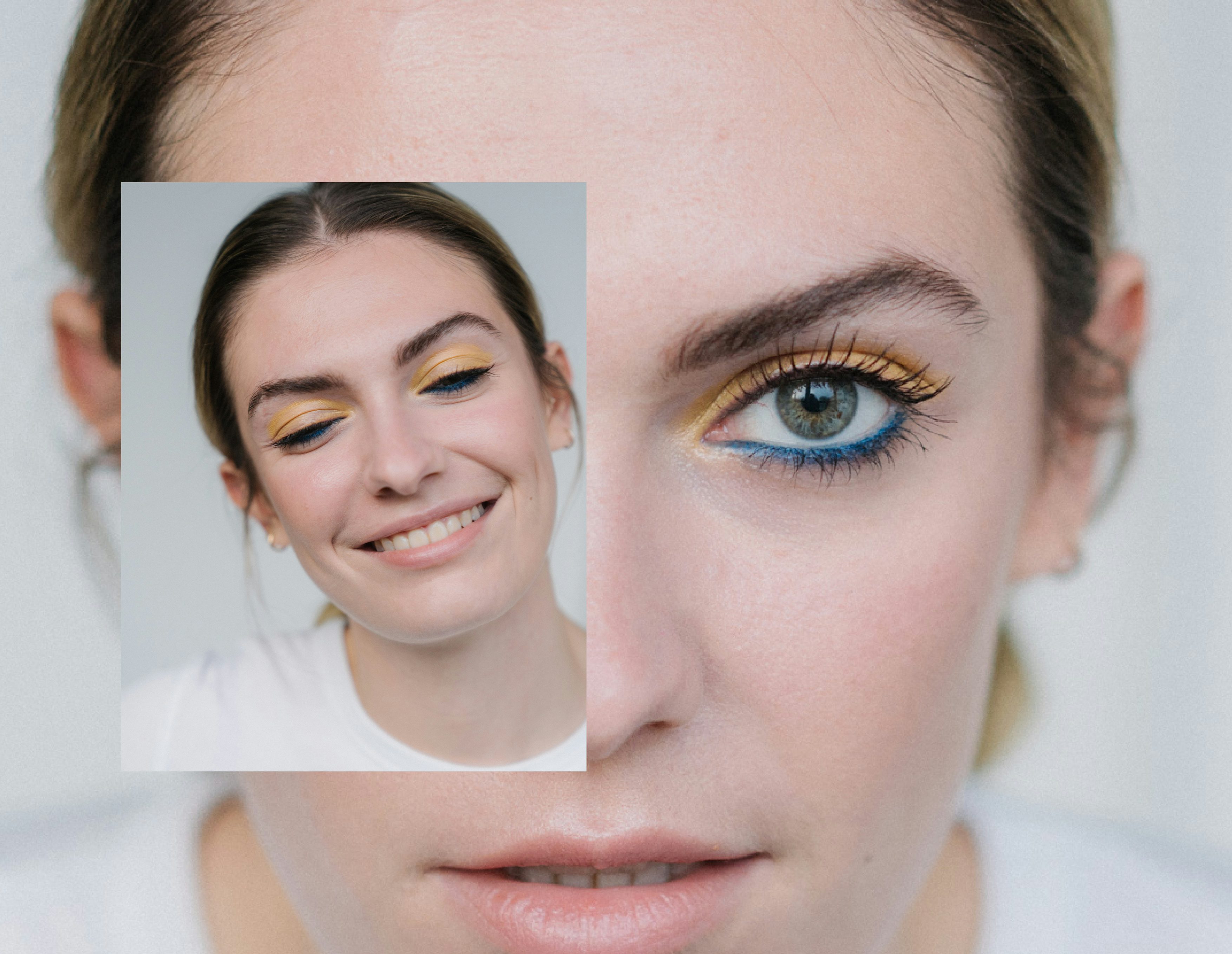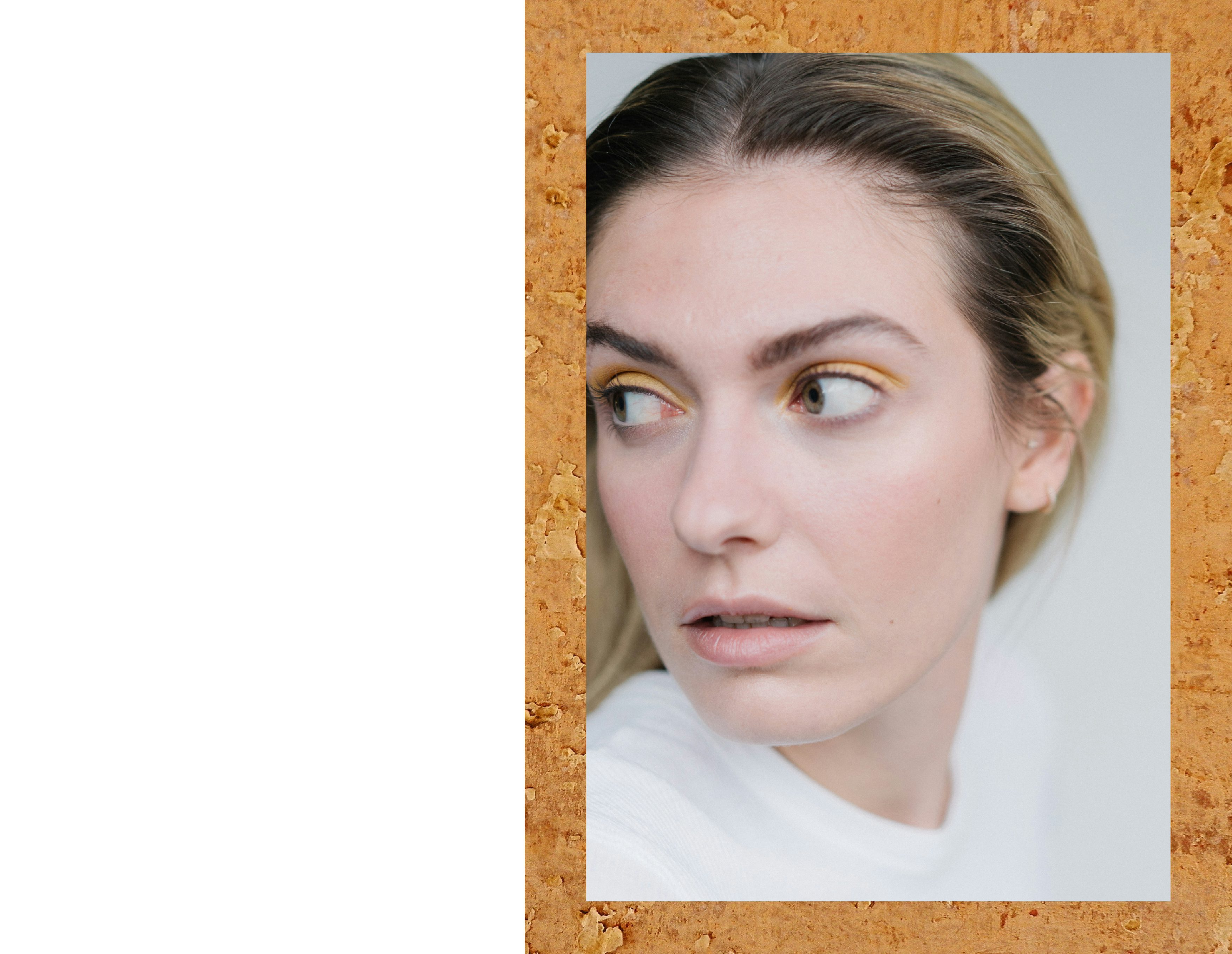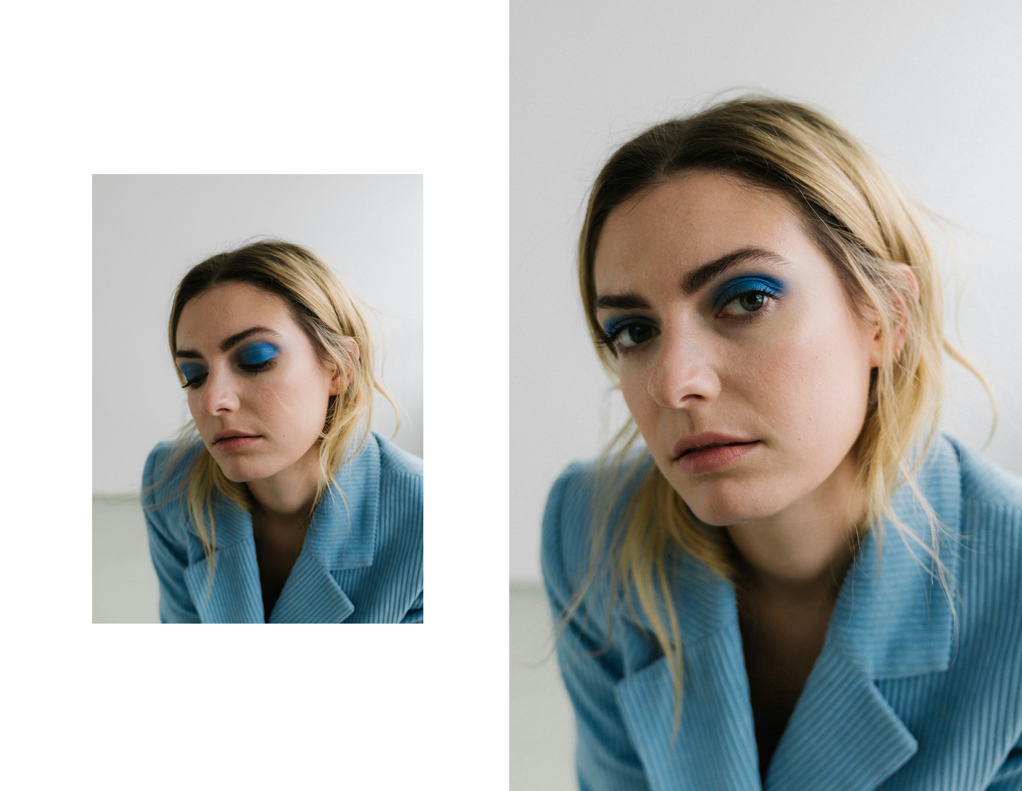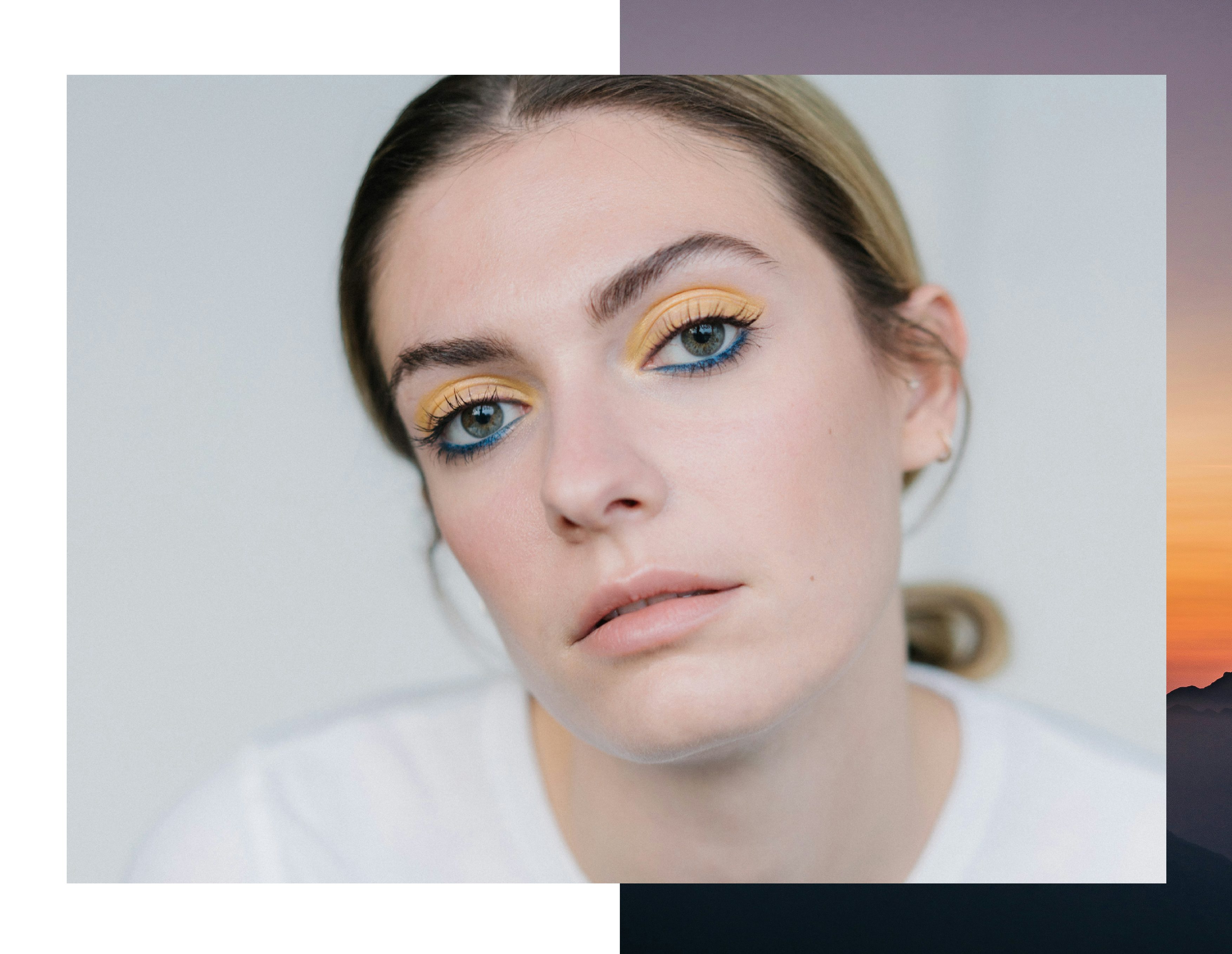 Inspiration für dieses Make-up war ein Sonnenuntergang. Von strahlend gelb bis zu dunklem Blau ist alles dabei. Sich auf der unteren Wasserlinie blauen Kajal ziehen, kostet erst einmal Überwindung, mit einem modernen Gegenpart auf dem oberen Lid kommen aber keine 80er-Gefühle auf. Wichtig: Wimpern kräftig tuschen – und ganz viel Spaß beim Tragen haben!