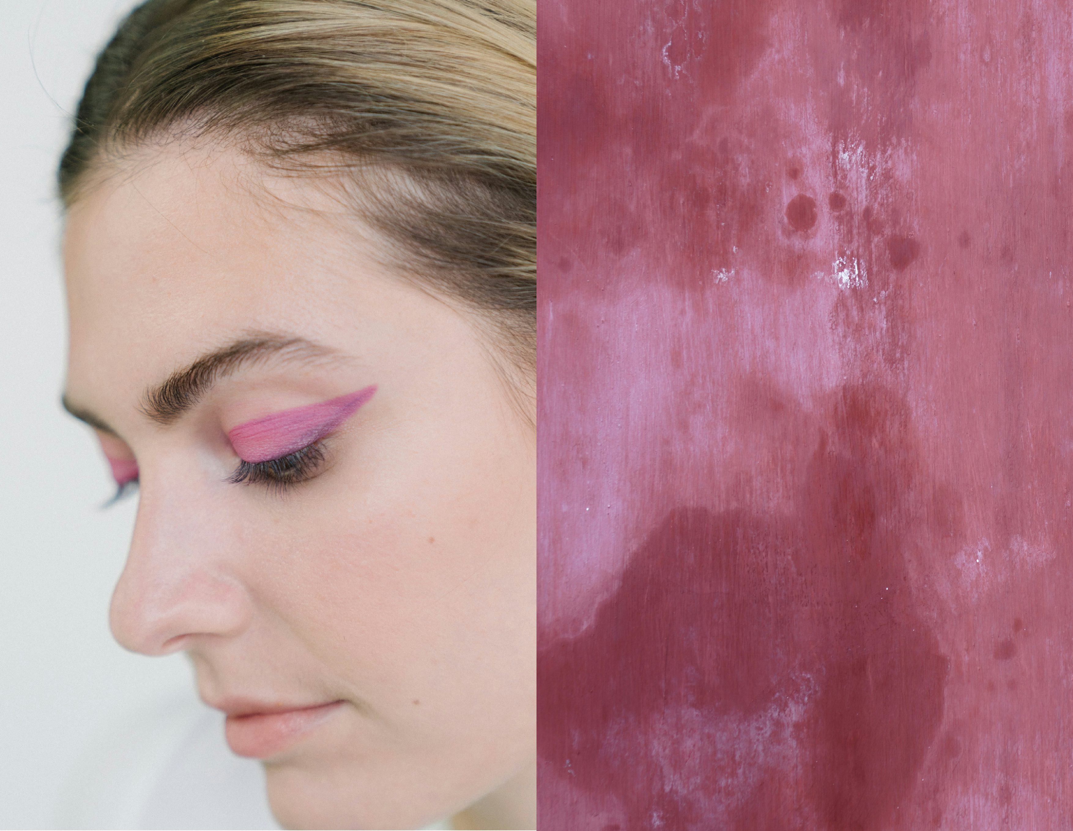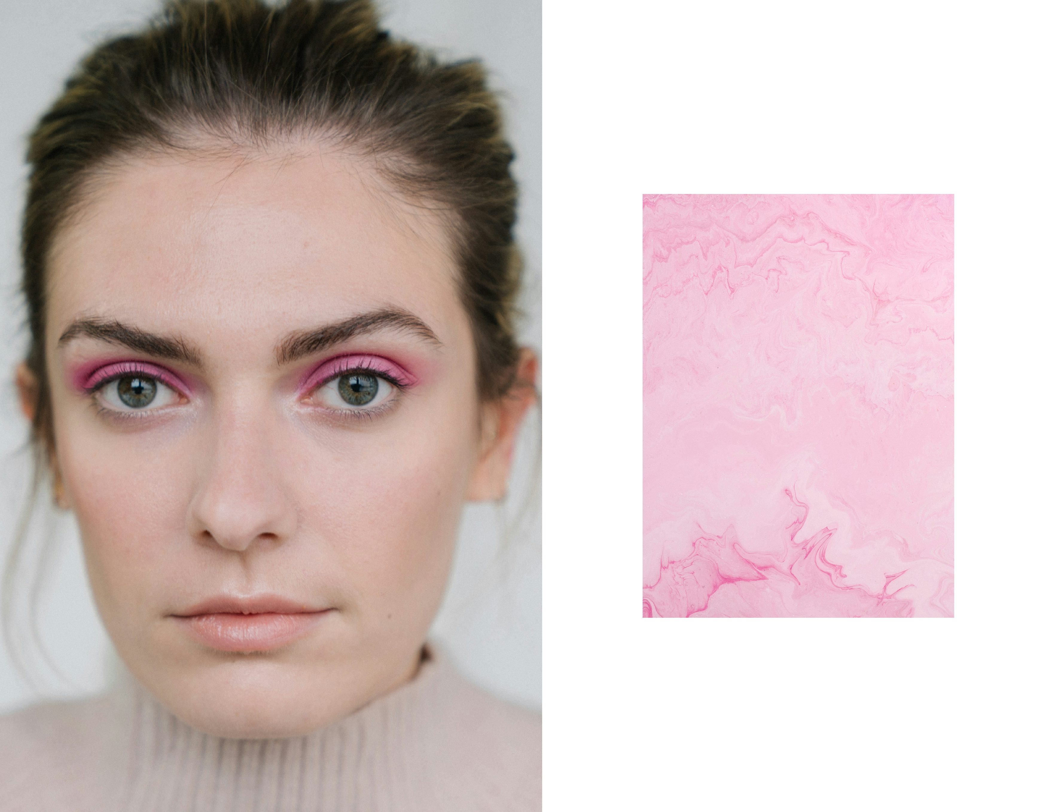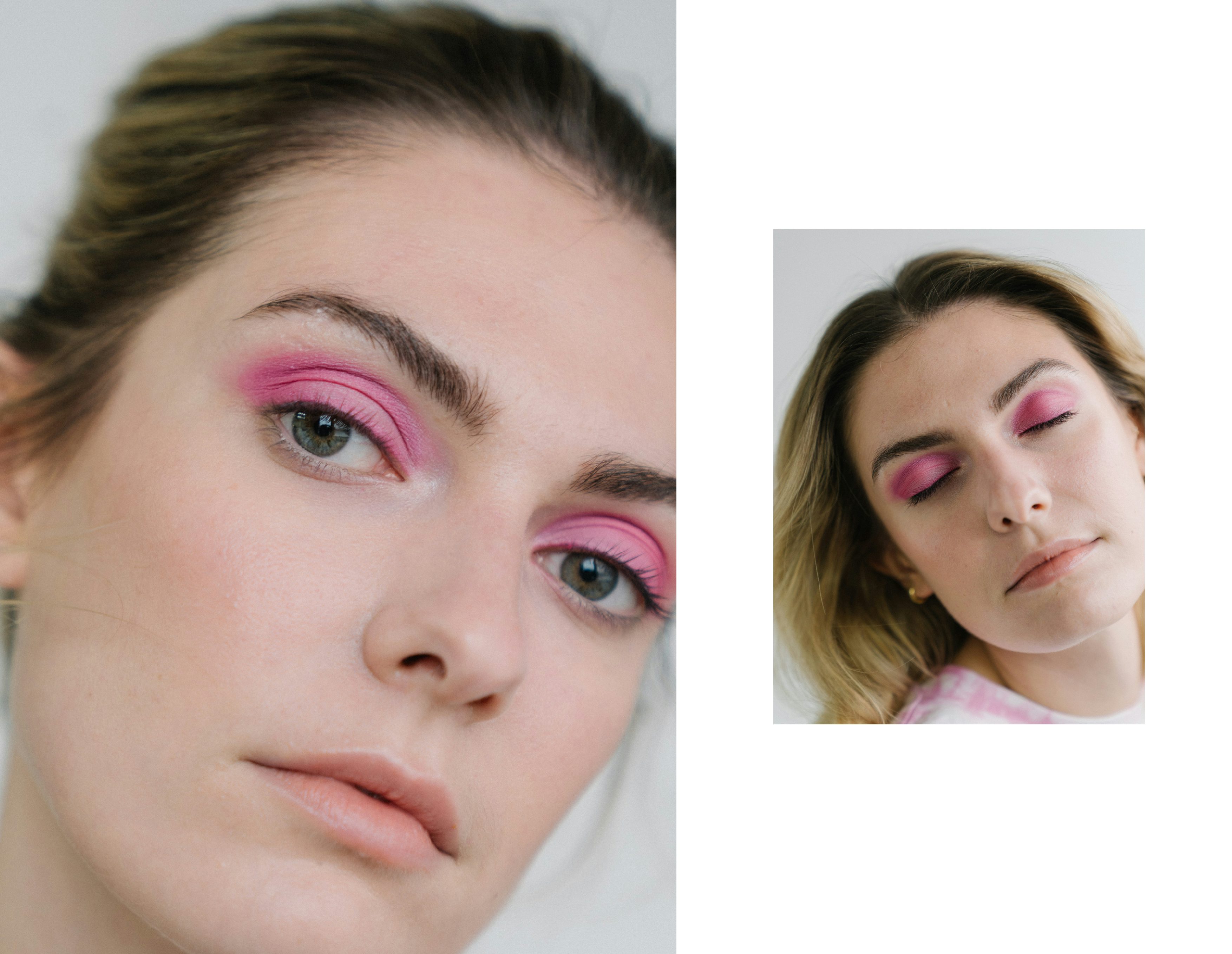 Keine ruhige Hand für den grafischen Look? Kein Problem, mit Rosa kann man auch einfach einen monochromen Lidschatten-Look kreieren. Dafür könnt ihr entweder pinken Lidschatten verwenden oder, noch einfacher, Blush oder Rouge – am besten stark pigmentiertes. Sollte es nicht deckend genug sein, feuchtet ihr einfach euren Pinsel mit Wasser oder Fixirspray an, das sorgt für eine erhöhte Deckkraft und verhindert gleichzeitig, dass der Lidschatten euch in eure Lidfalte kriecht und dort creast.