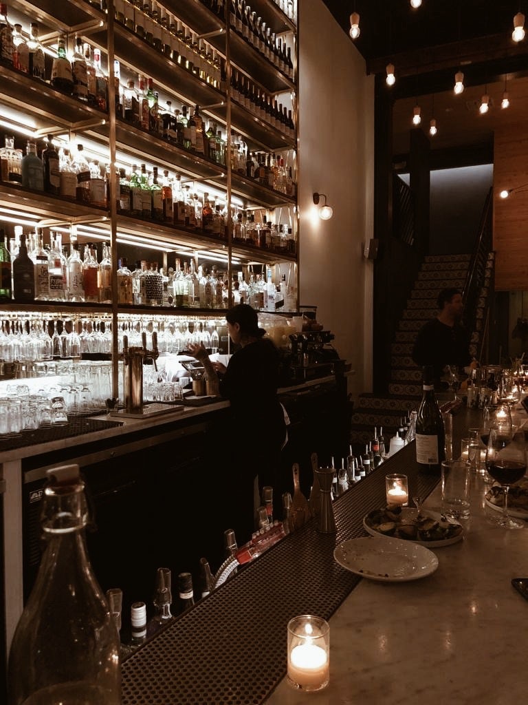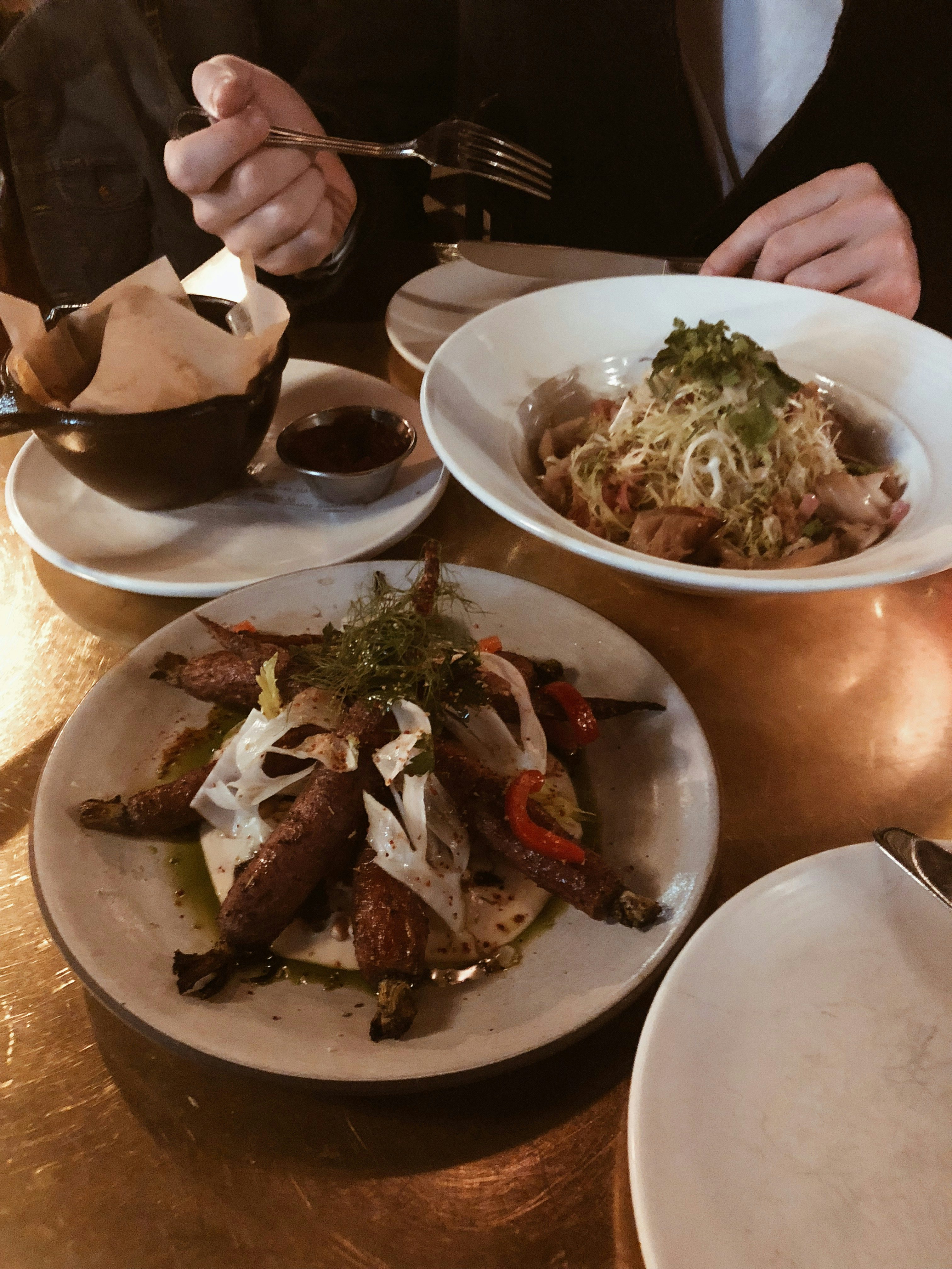 Sie nennen sich selbst rustikal italienisch, ich würde eher sagen, modern italienisch, sehr fein gewürzt. Bei uns kamen im Kettle Black Knoblauchbrot, gerösteter Blumenkohl, Sellerie-Püree und gefüllte Trüffelpasta auf den Tisch, dazu die leckerste Zitronenlimonade, unbedingt bestellen. Umsonst dazu gibt's das schöne Interior, mit lebendem Wandgemälde, tausend goldenen Glühbirnen und einer beeindruckenden, wandhohen Bar.
