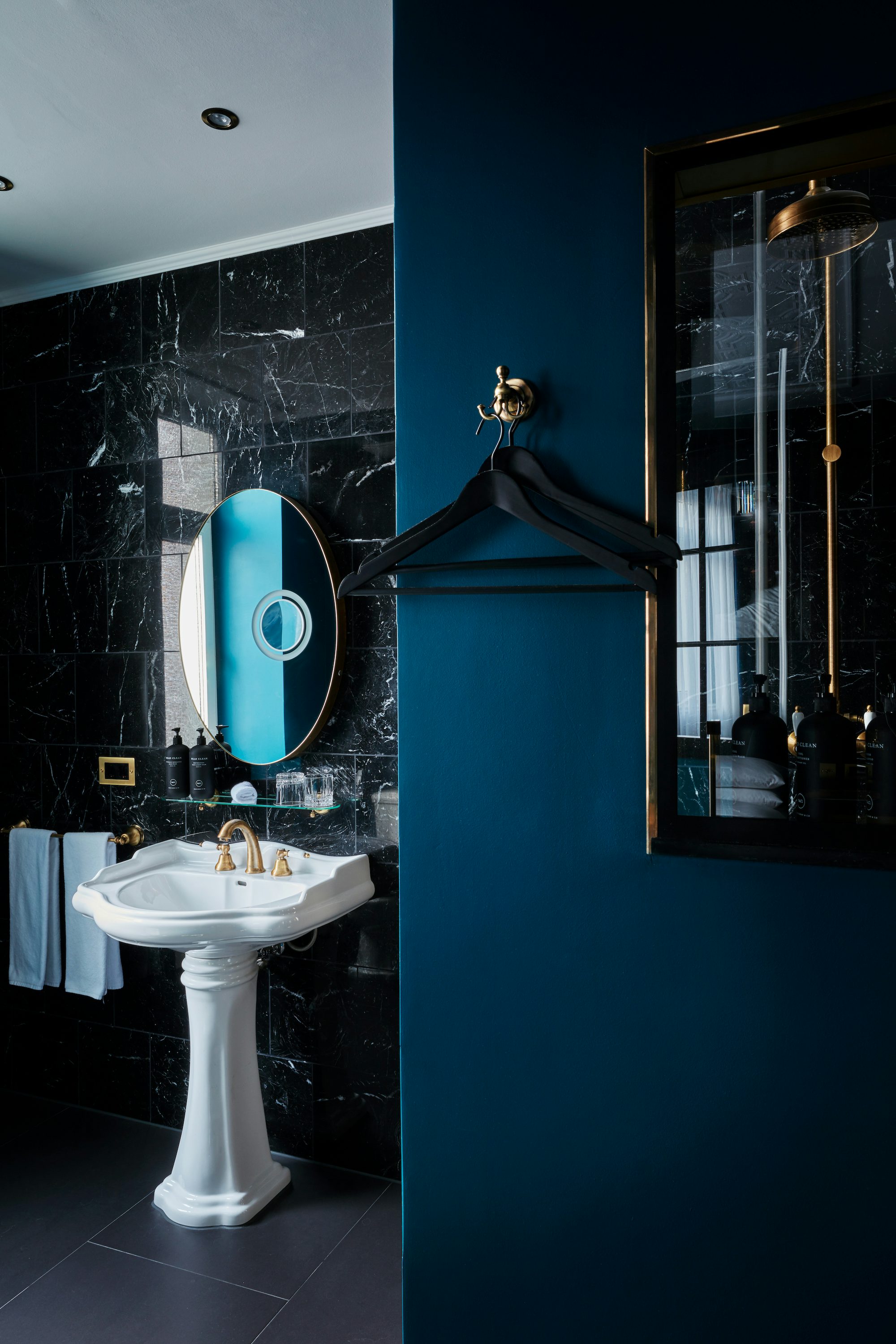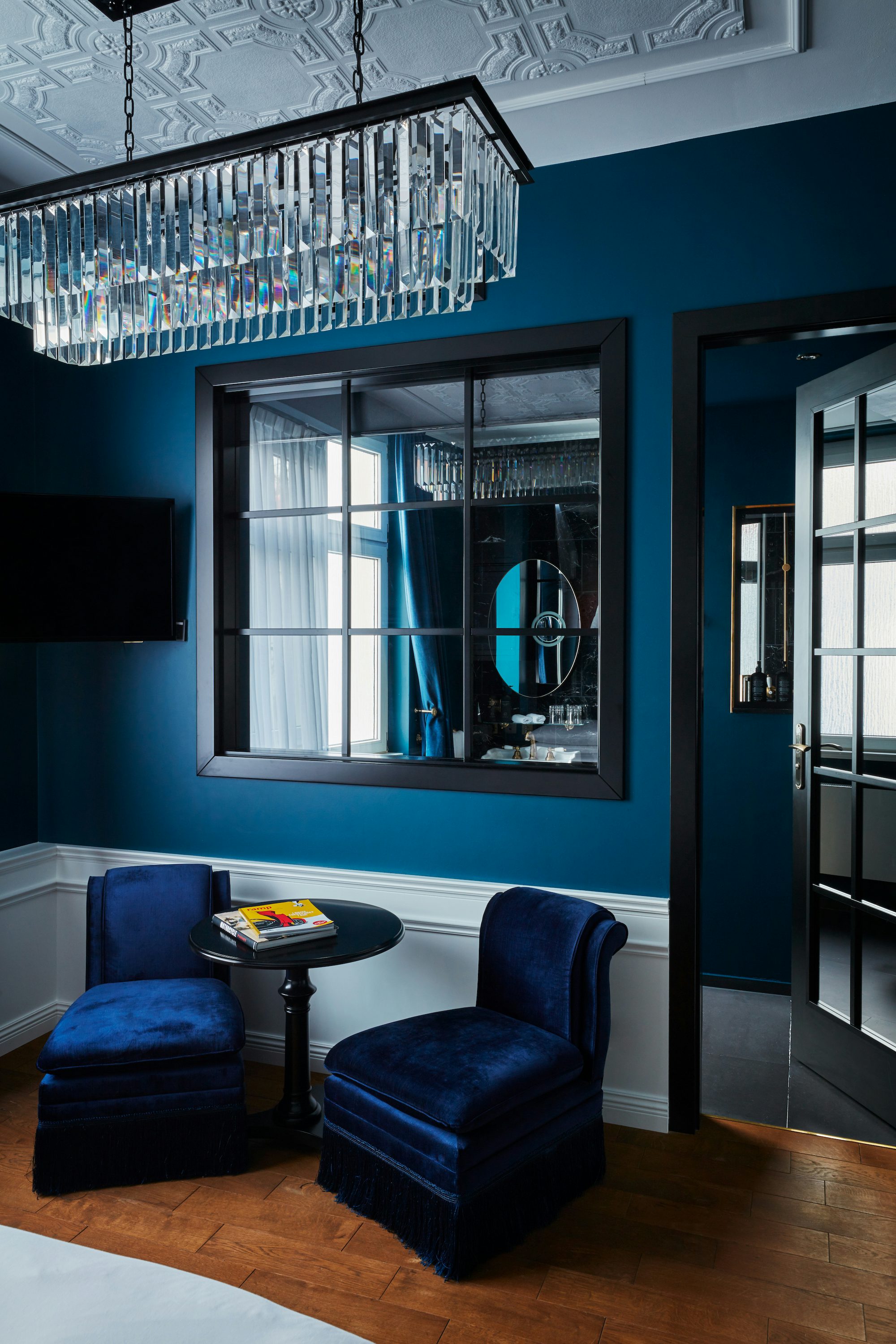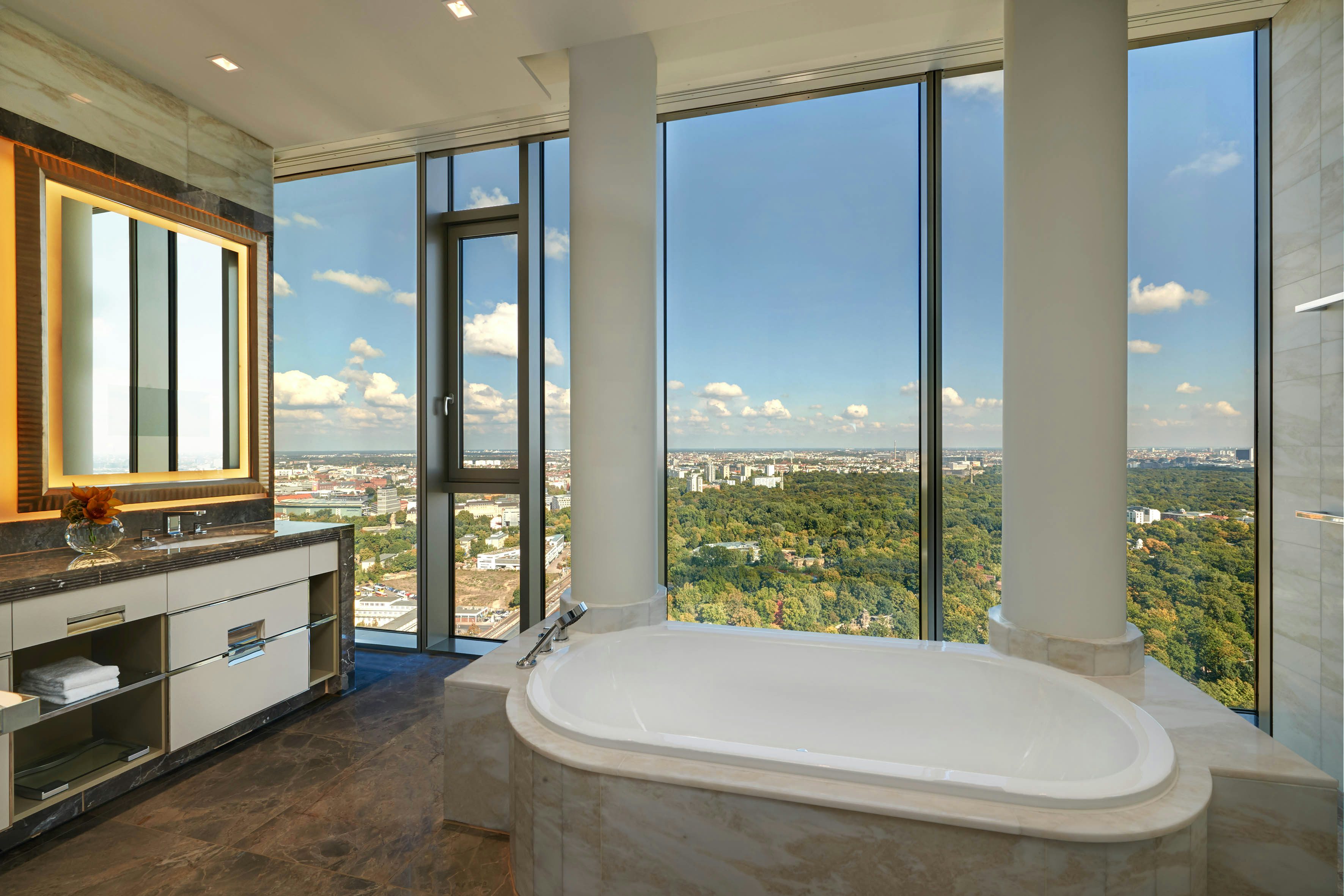 Für die Inneneinrichtung war die Pariser Agentur Inter Art Etudes verantwortlich und das sieht man auch: Art déco trifft auf Modernität. Bei den Suiten und Zimmern besonders atemberaubend: die Bäder mit dem Ausblick über ganz Berlin.