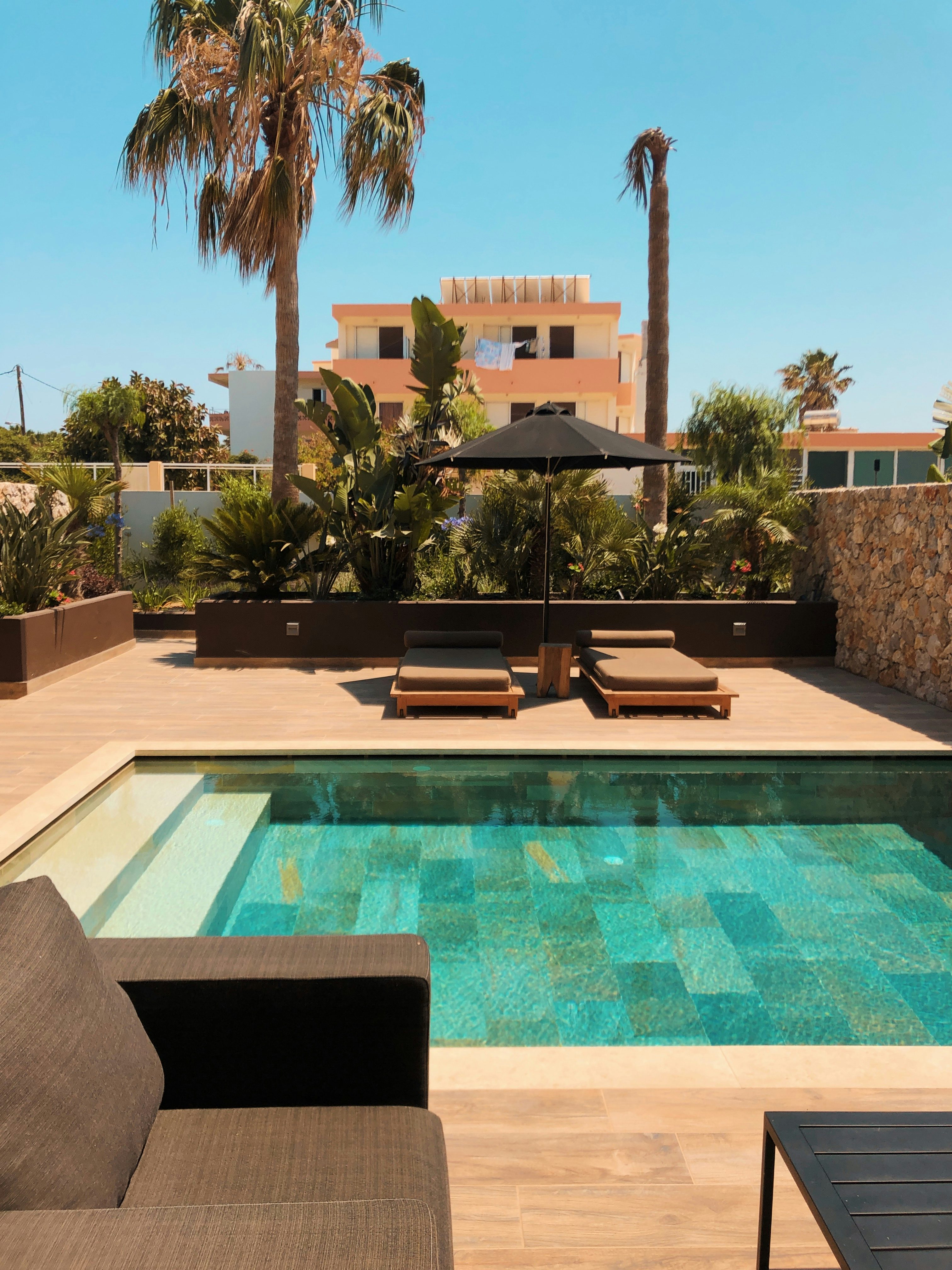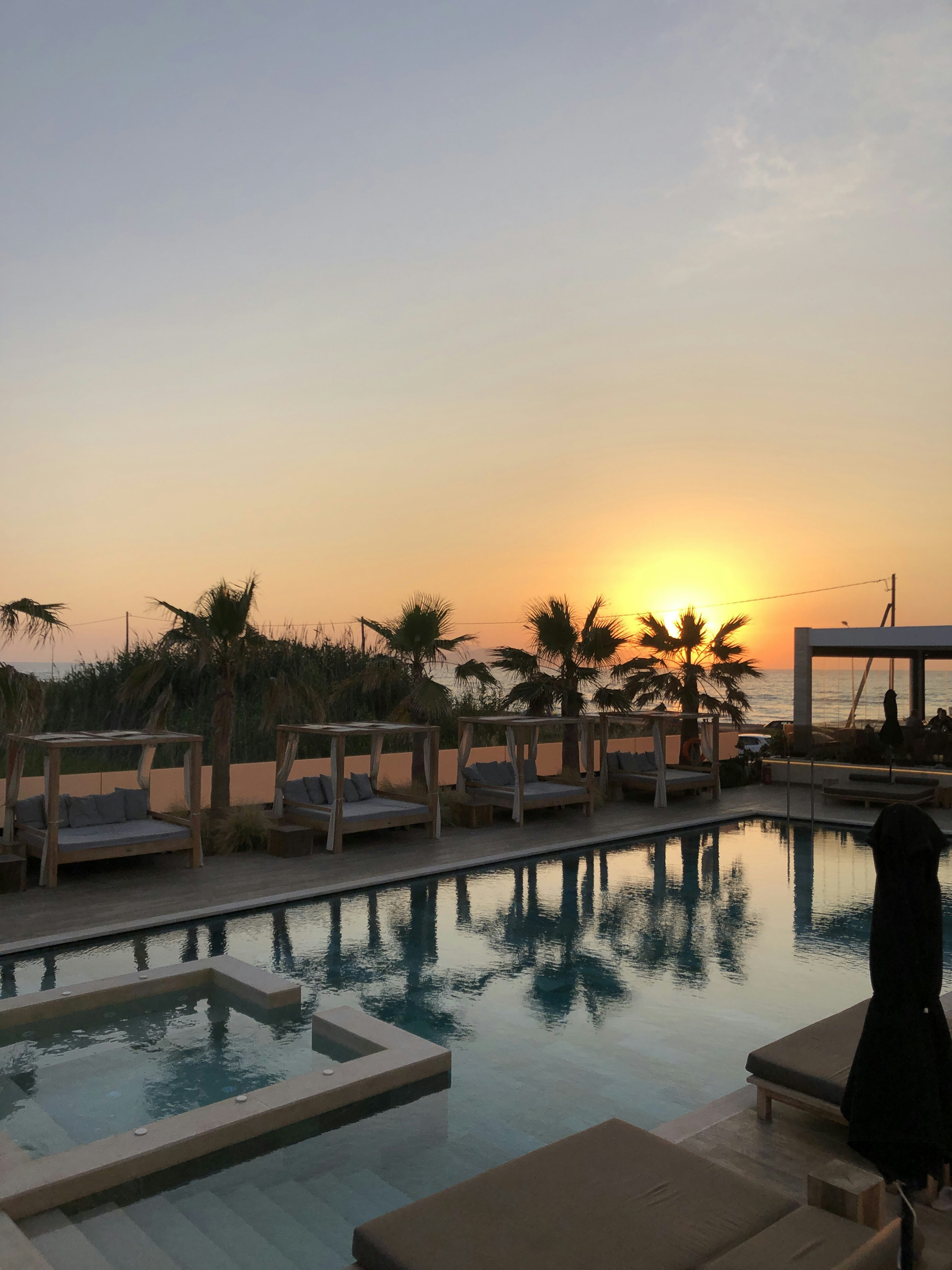War trotz der kleinen Griechenlandenttäuschung ziemlich groß. Denn wenn einem die Umgebung nicht umhaut, dann ist es umso besser, wenn das Hotel es tut. Und das tat es. Eine kleine Suite, ein riesengroßer Außenbereich und ein eigener Pool ließen keine fünf Minuten Langeweile aufkommen, ganz im Gegenteil, ich bin so braun wie noch nie in meinem Leben, habe eine neue Sucht für Zeit Verbrechen, Sabine Rückert und den dazugehörigen Podcast entdeckt – und zwischendurch mal kurz überlegt, ob ich meine Karriere nicht schmeiße und zur Kriminalpolizei wechsle, ohne Spaß – und mich zu 50 Prozent nur von Iced Coffee ernährt. Kein Laptop, keine Bewegung (außer die Verzweiflung sich selbst am Rücken mit Sonnencreme einzucremen), kein Kontakt zur Außenwelt. Besser geht es nicht. Die Sonnenuntergänge waren dann übrigens doch genauso spektakulär, wie ich sie mir erträumt habe.