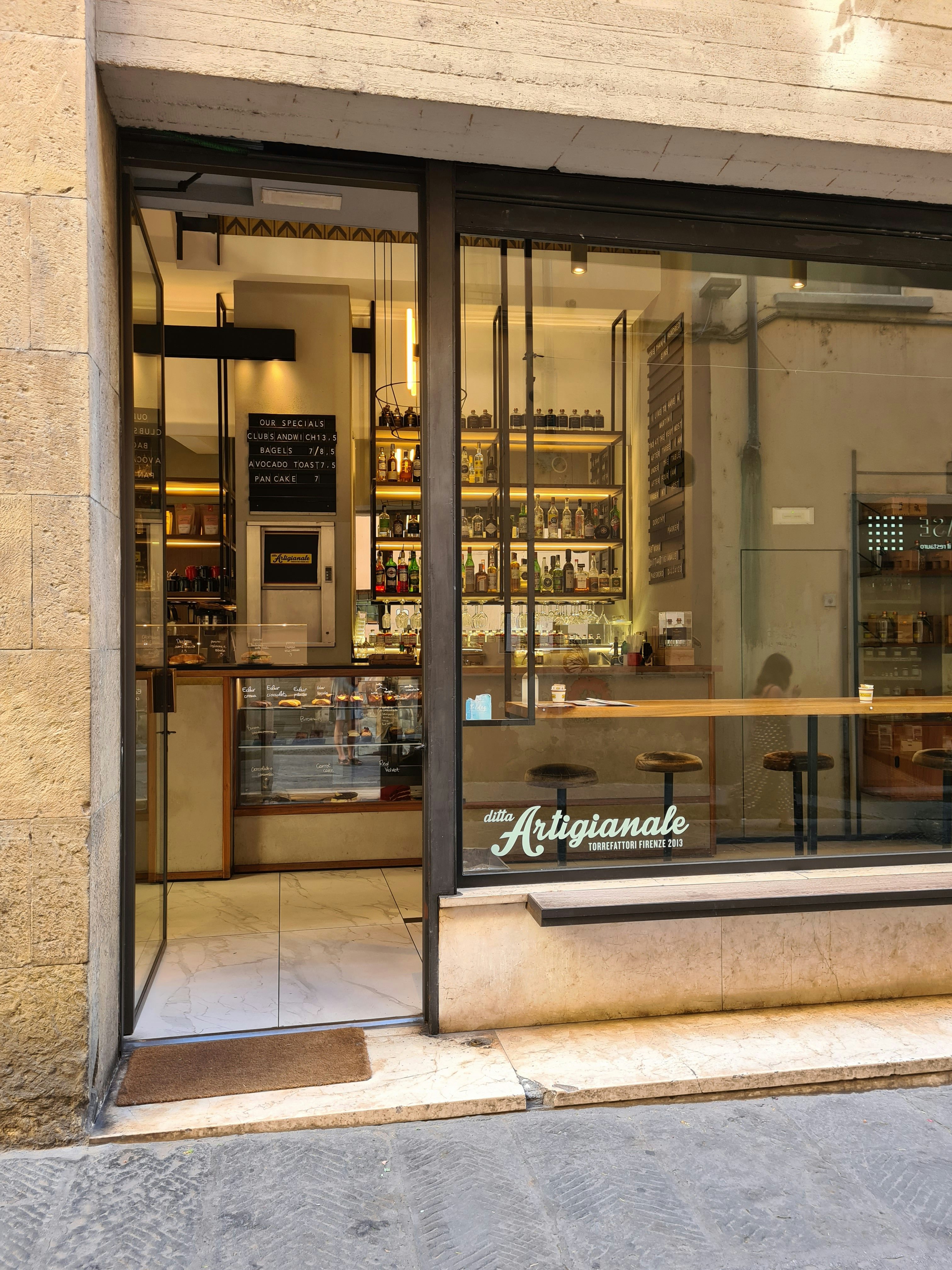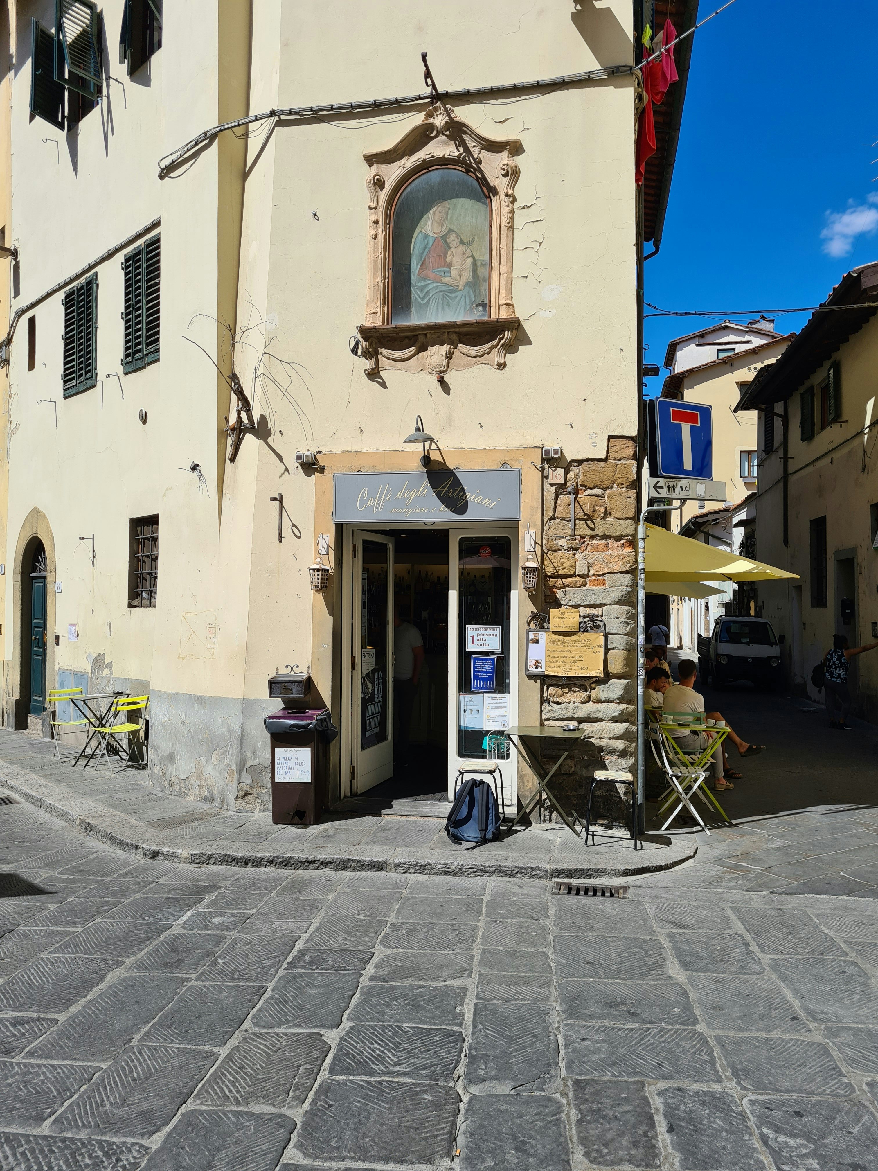 Wenn ihr beim Kaffeegenuss draußen sitzen und Menschen beobachten wollen, ist die Bar d'Angolo mein Favorit – abends könnt ihr hier auch Aperitivo abhalten. Wenn ihr Lust auf einen richtig guten Flat White, einen kühlen Cold Brew oder einen fantastischen Coffeemisù, eine Mischung aus Kaffee und Tiramisù, habt, dann besucht unbedingt eine der drei Florentiner Filialen der Ditta Artigianale. Die Rösterei hat außerdem leckere Snacks und Erfrischungen im Angebot, mit denen ihr euch den Tag versüßen könnt.