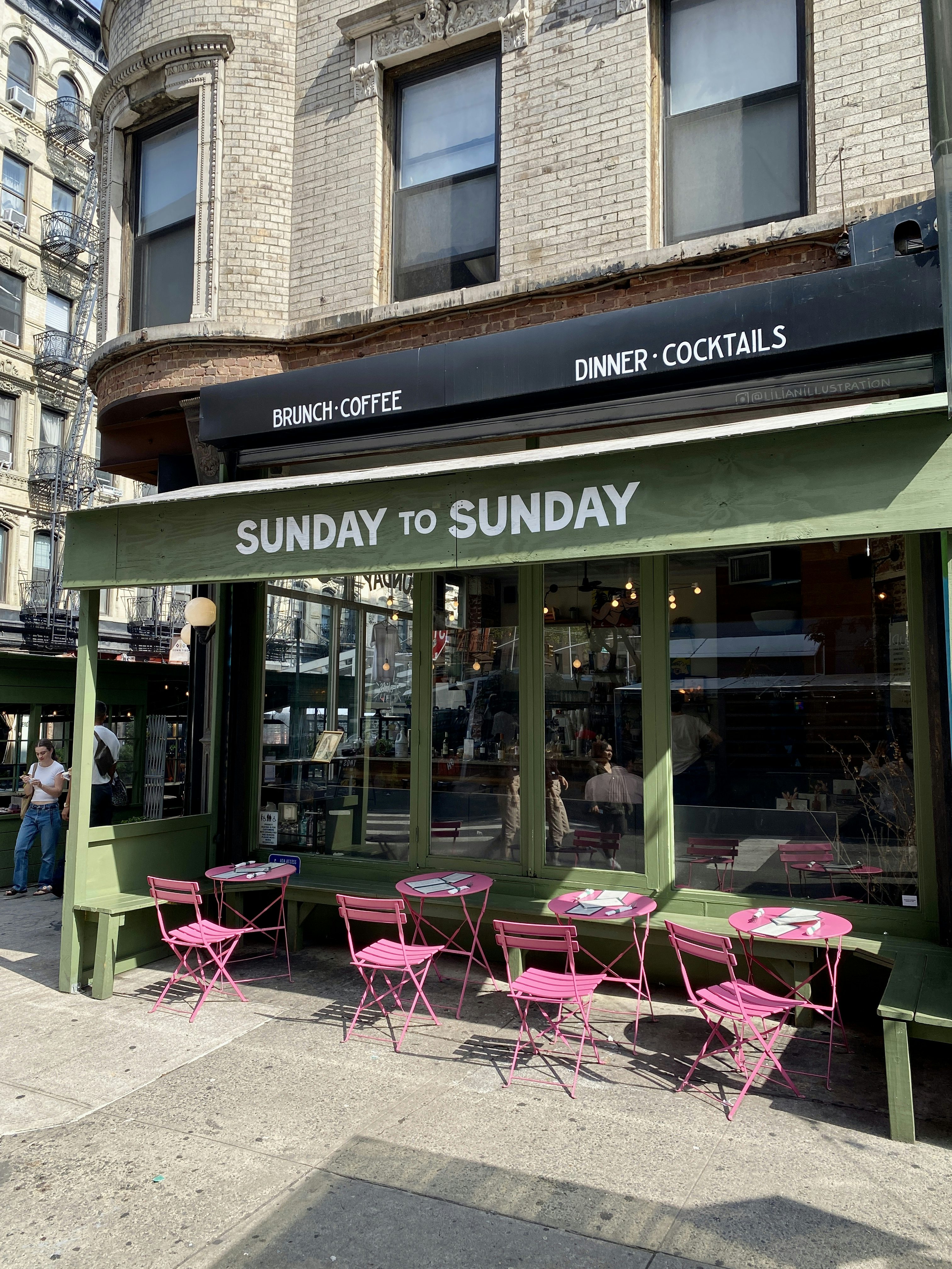Ein wunderbares Café in einer der schönsten Ecken Manhattans. Im Außenbereich des Sunday to Sunday auf dem Gehweg kann man nicht nur den New Yorker Streetstyle bei einem Avocado-Toast begutachten, sondern auch die kleinteilige und zusammen gewürfelte Architektur der Nachbarschaft bestaunen. Ein perfekter Ort für eine Pause und ein Fotoshooting für Social Media.