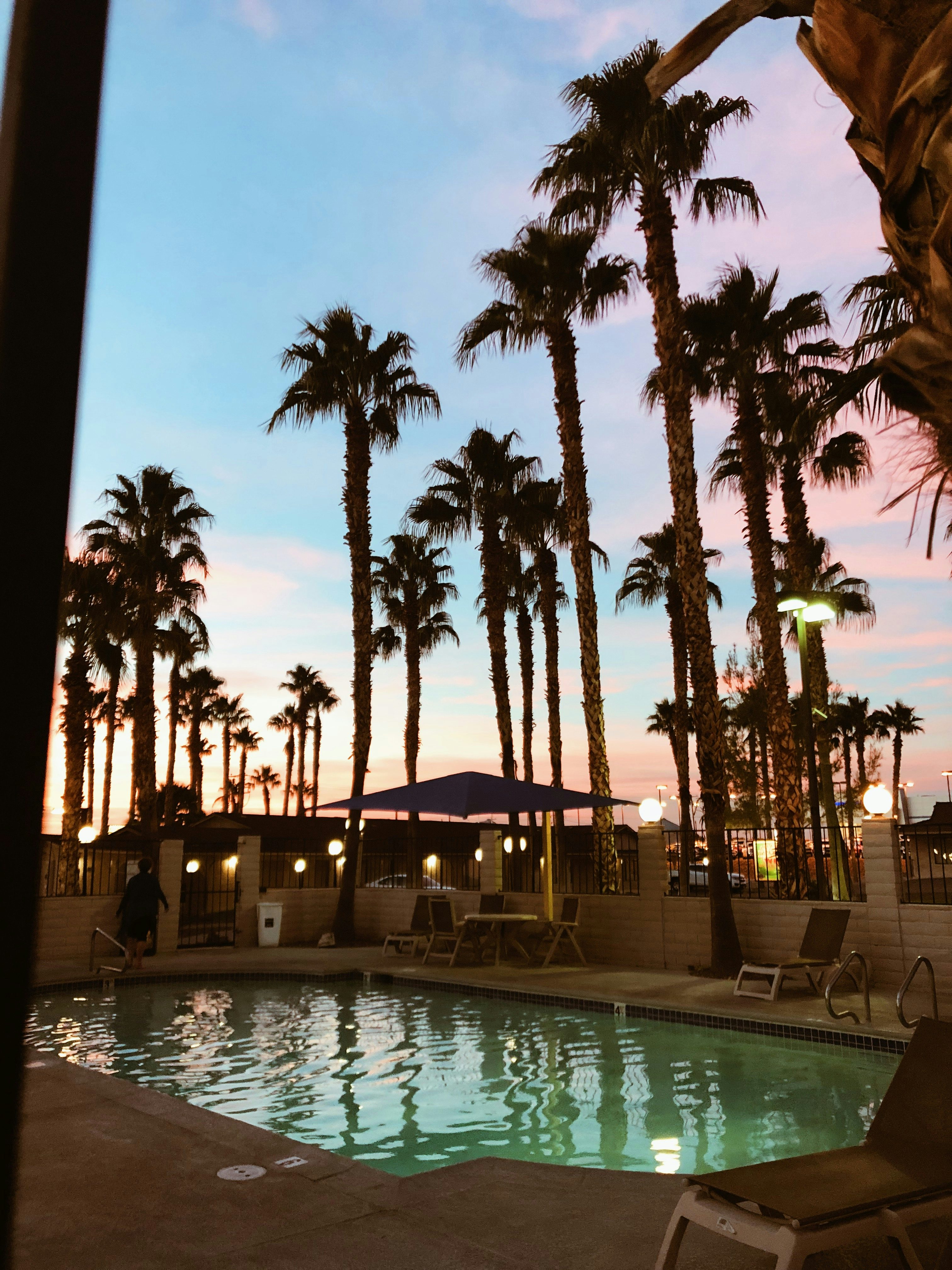 Keine halbe Stunde später waren wir auf einmal allein. Und auf der Suche nach einer Unterkunft für die Nacht. Wieder einmal wurden wir überrascht, denn mitten im Nirgendwo, in einer kleinen Stadt namens Pahrump, hinter den Mauern einer Motelkette, wartete einer der schönsten Sonnenuntergänge unter Palmen, den wir auf der ganzen Reise sahen. Dazu verbrachten wir die Nacht mit Spagetti im hauseigenen Restaurant und lauschten dem Plätschern des Whirlpools.
