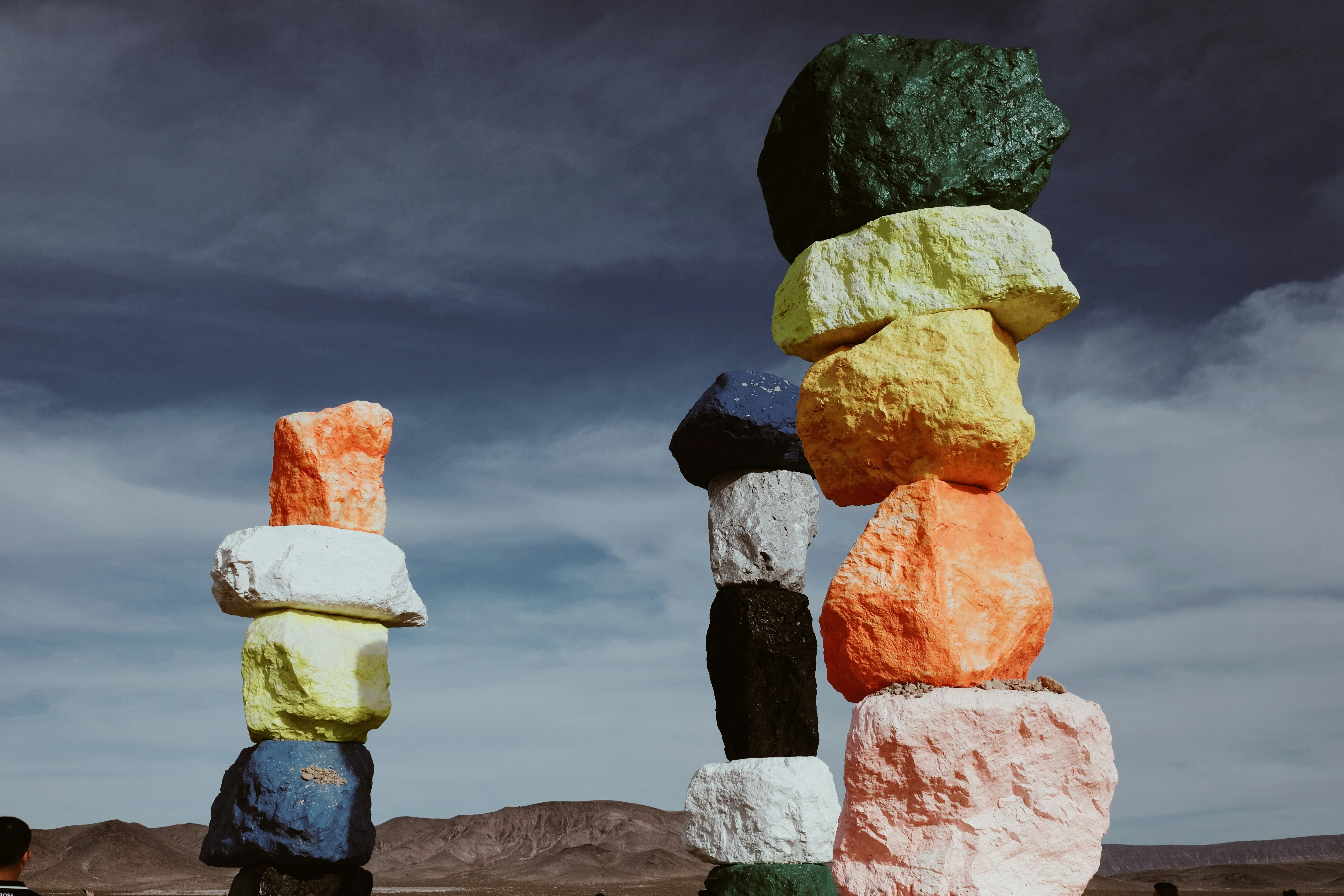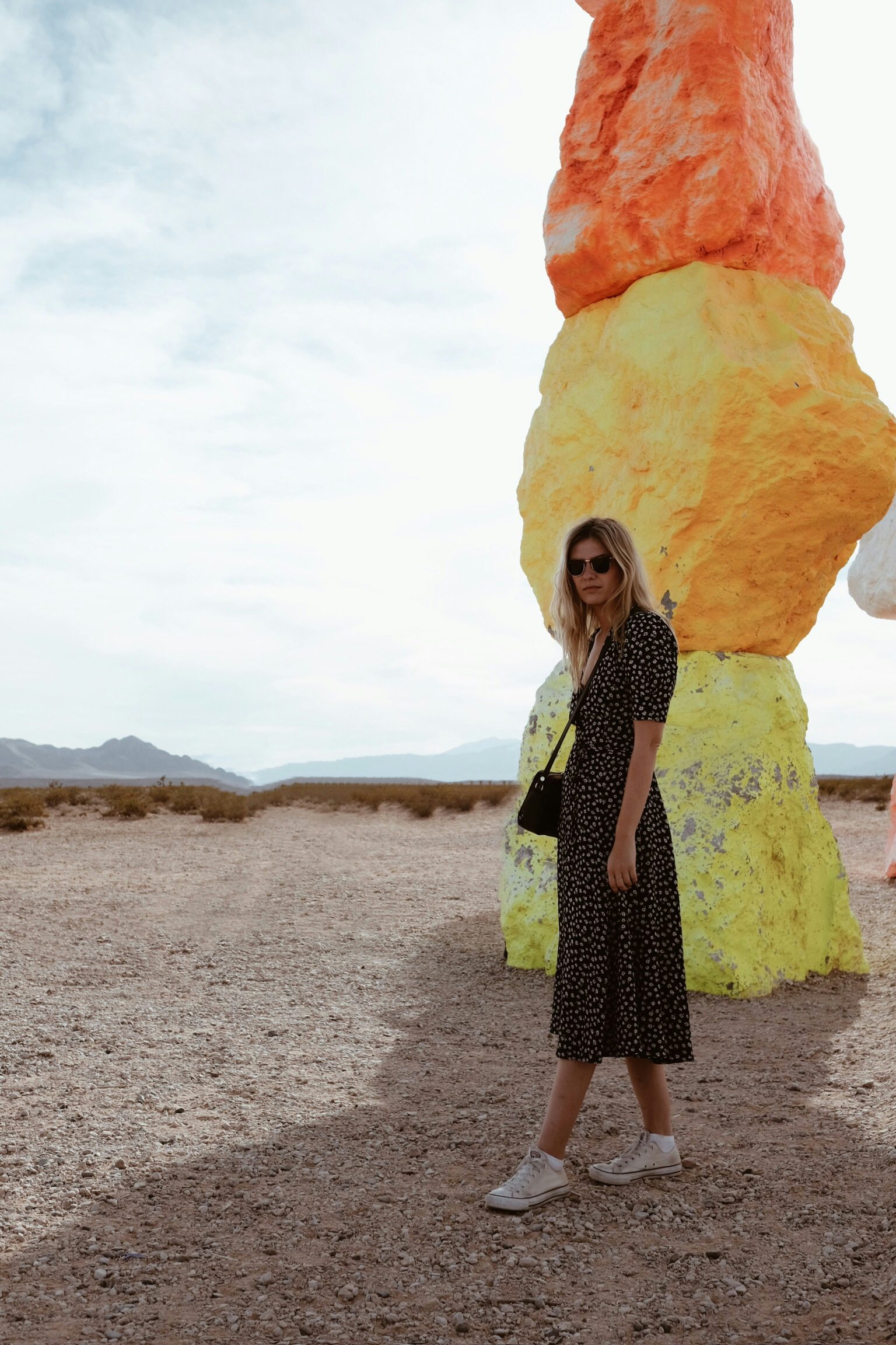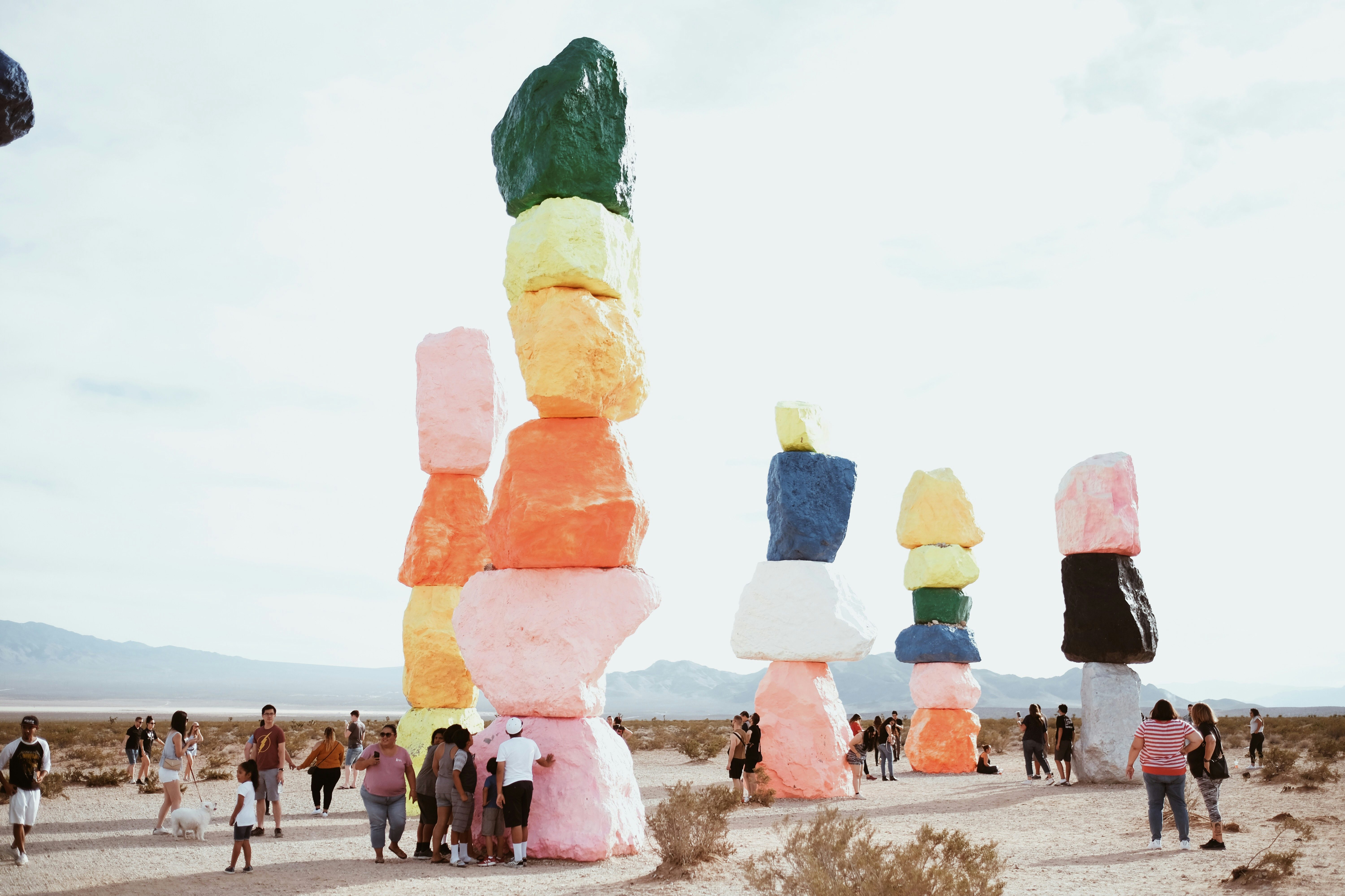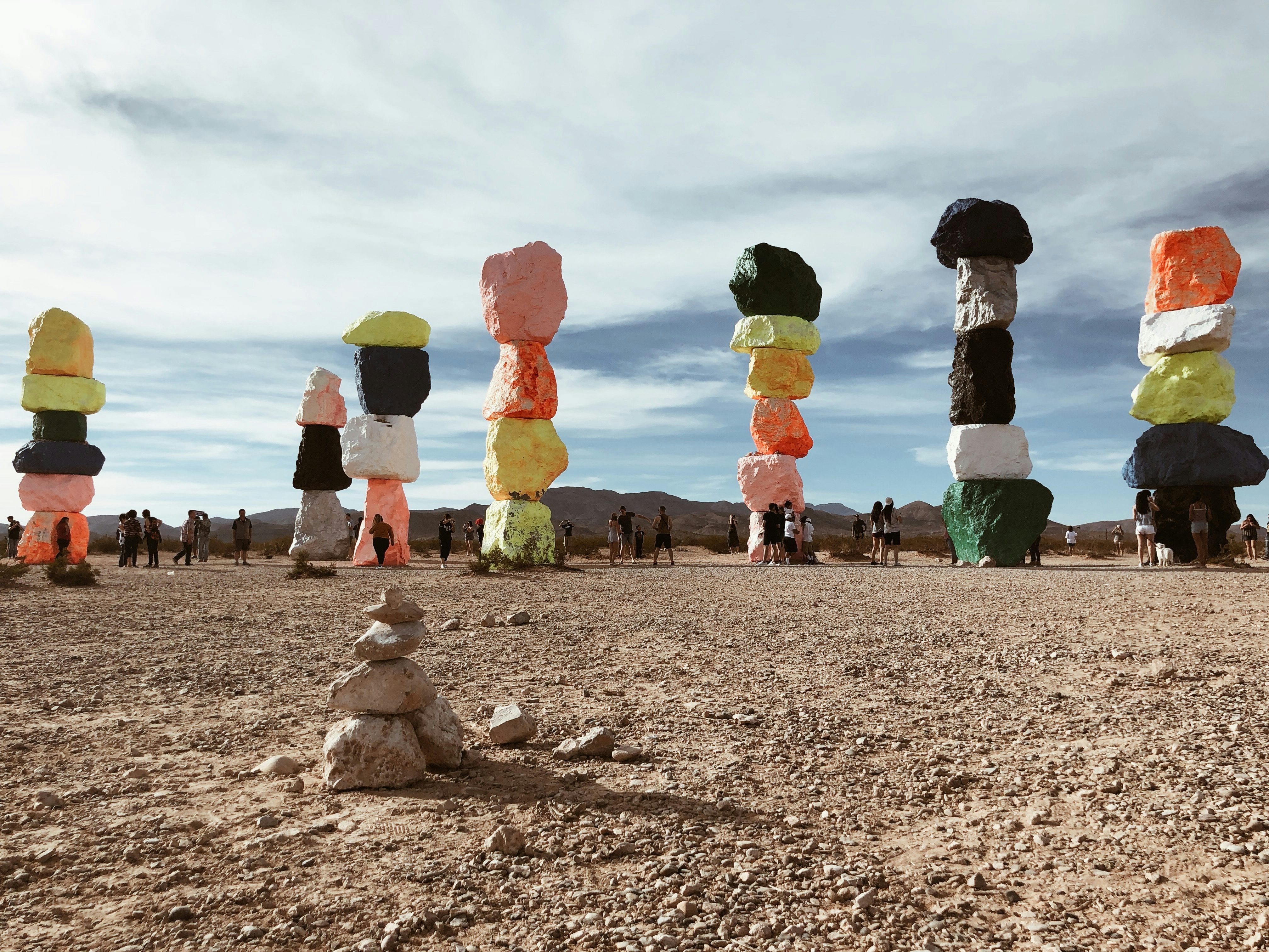 Als Nervennahrung gab es für mich dann noch ein Eis und schon ging es weiter in Richtung Kalifornien. Einen Halt machten wir in Nevada aber noch und diesen hatten wir Instagram zu verdanken. Übrigens wie viele andere Tipps, die ich vor der Reise durch intensive Scroll-Recherche gefunden hatte. Die Seven Magic Mountains sind ein Kunstprojekt von Ugo Rondinone, einem Schweizer Künstler, der in Harlem lebt. Beim Ankommen dann aber die (vorhersehbare) Enttäuschung, denn was auf Social Media gehypt wird, kann leider kein Geheimtipp mehr sein. Aus der Ferne waren die knallbunten Steinberge nicht zu übersehen, aber genauso wenig die mehreren Hundert Touristen, die sich an den Füßen dieser tummelten – schöne Fotos zu machen war quasi unmöglich. Nachdem dann noch zwei Schulbusse anhielten und zu den Touristen zehn Schulklassen dazukamen, reicht es uns. Schnell weg!