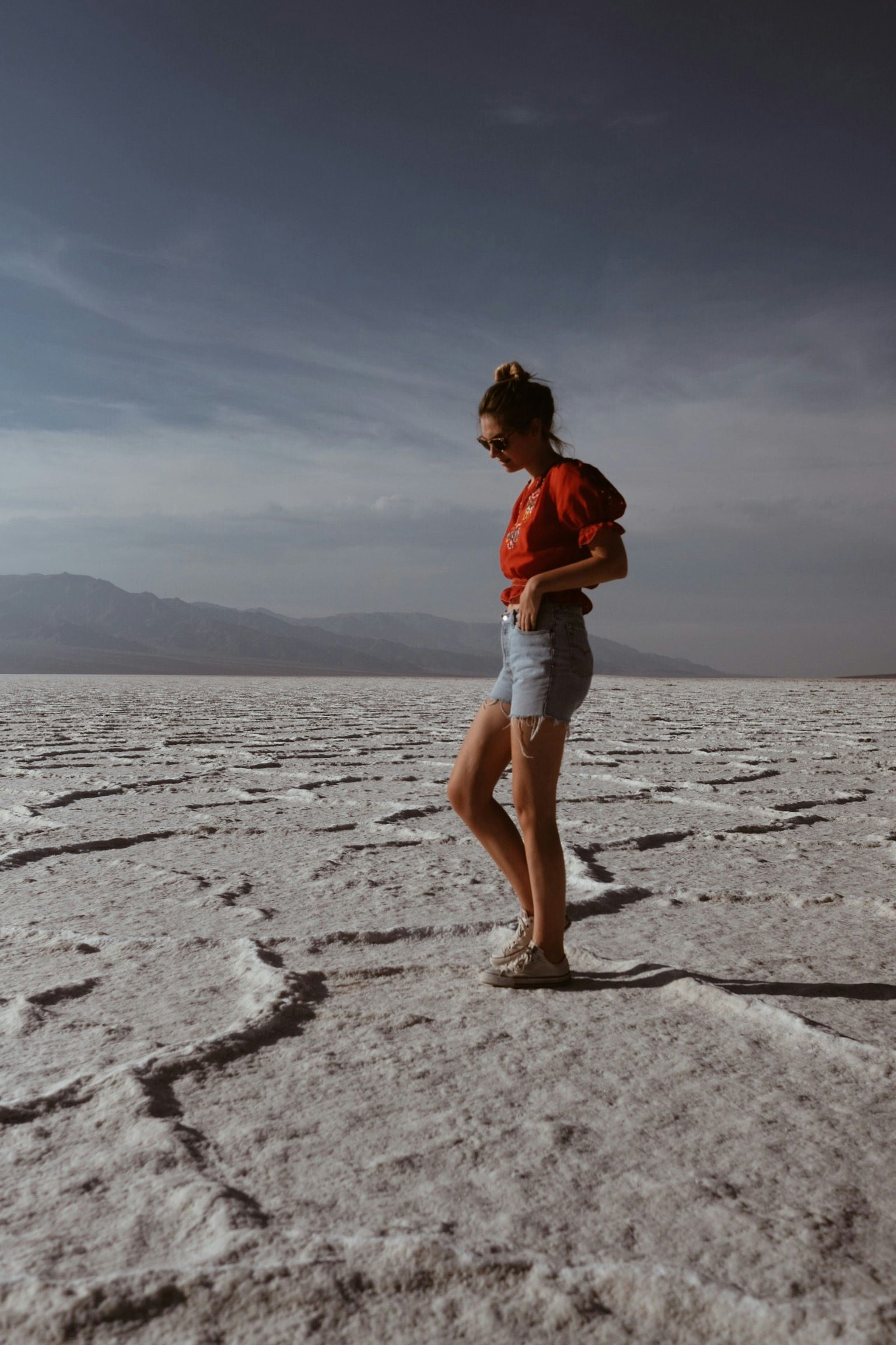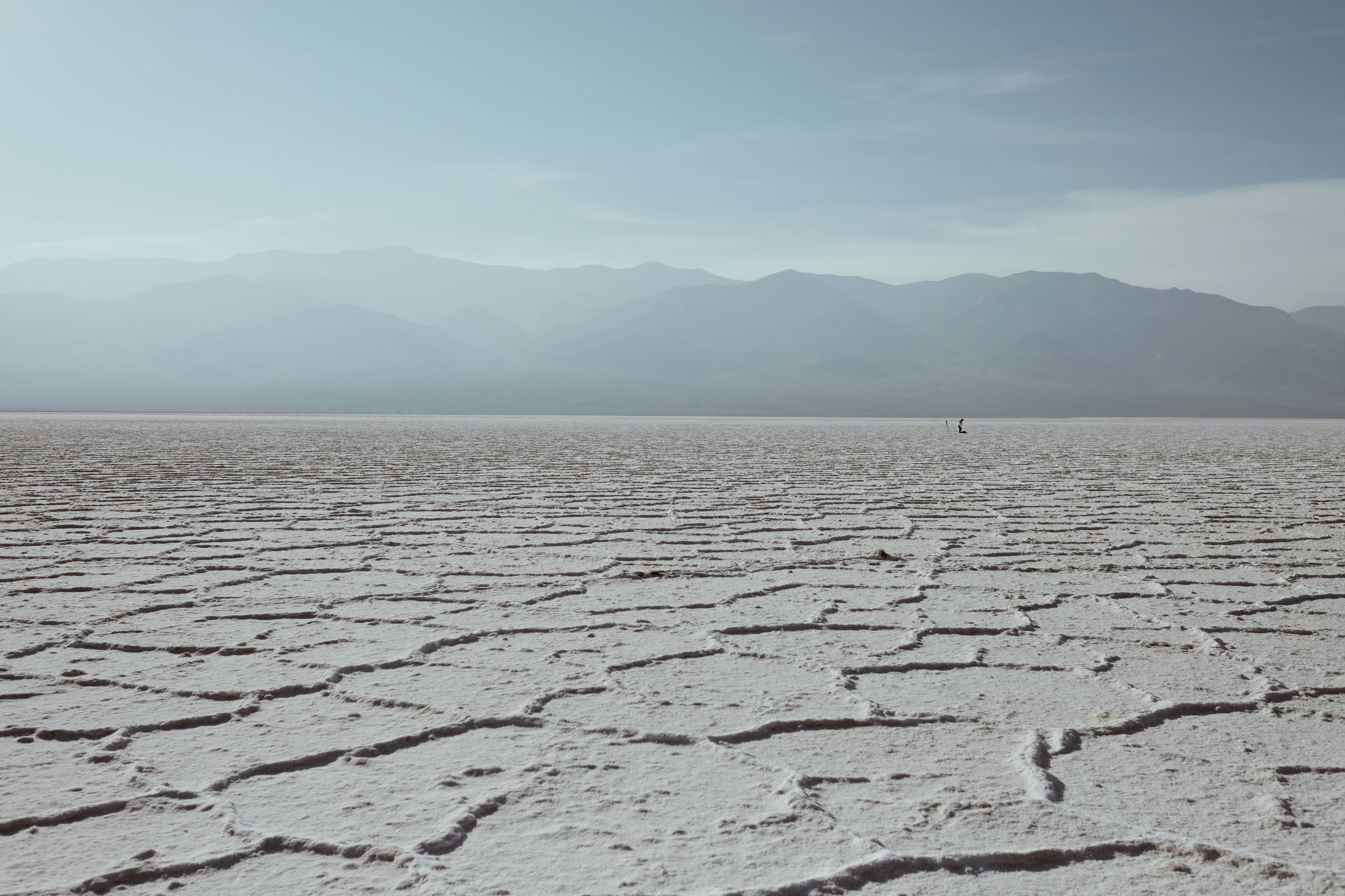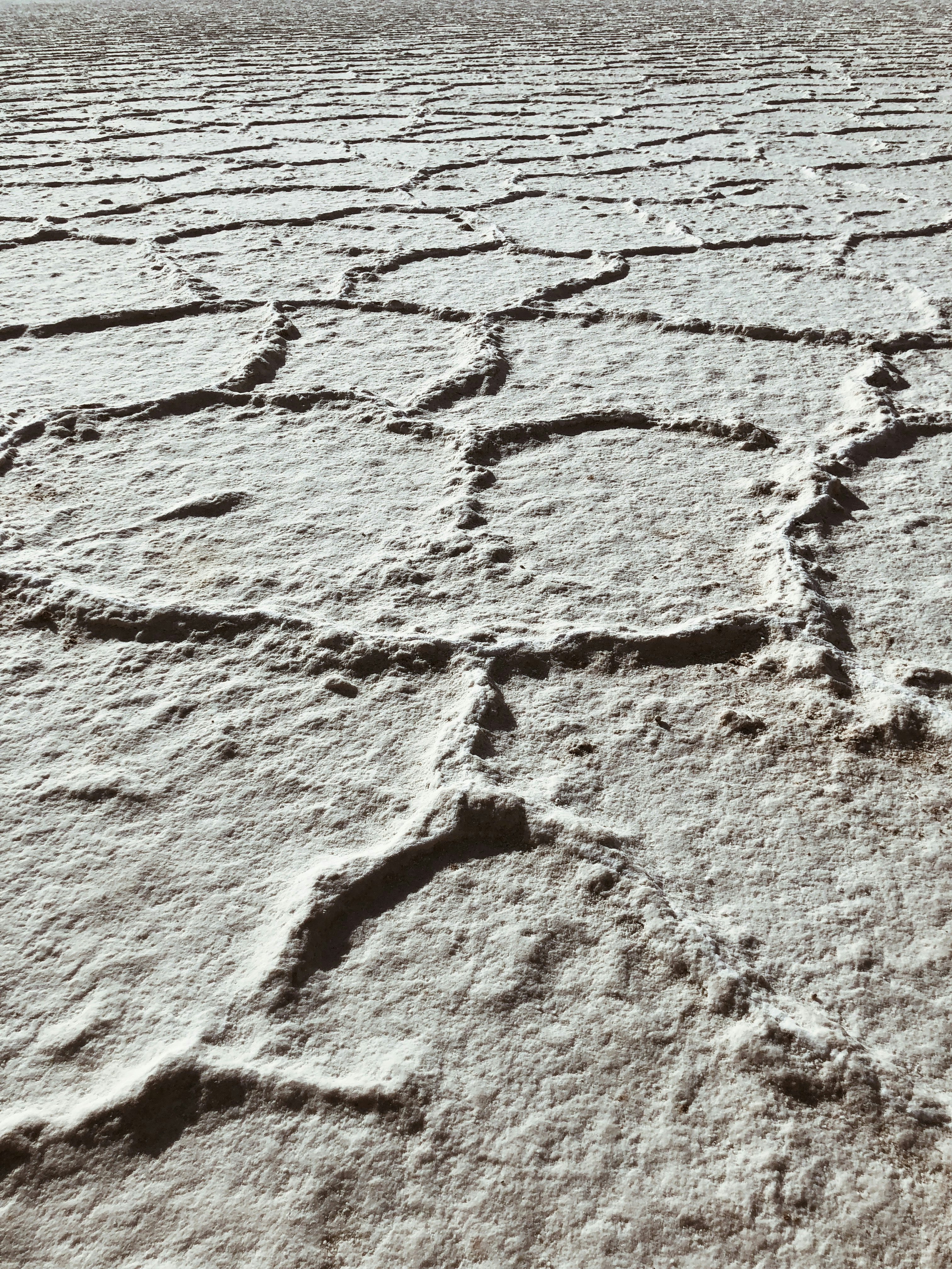 Im Hochsommer das Tal des Todes zu besichtigen, ist deswegen vielleicht nicht die beste Idee, wir hatten mit Mitte 30 Grad aber einen angenehm „kühlen“ Tag erwischt. Auch wenn mir das zwischendurch, als der Schweiß in meinen Augen brannte und die Stirn herunterlief, nicht so vorkam. Besonders heiß war es im Badwater Basin, dem tiefsten Punkt der USA mit einer Höhe von 85,5 Metern unter dem Meeresspiegel. Das resultiert in einer Salzwüste mit wunderschönen sechseckigen Strukturen auf dem Boden, vor 3000 Jahren ein tiefer See. Ein unwirklicher Ort, weil man sich fühlt wie auf einer Schneepiste, gleichzeitig aber in Shorts und T-Shirt in unfassbarer Hitze und seinem eigenen Schweiß steht. Solltet ihr nach diesem Reisebericht einmal dort sein, dann packt auf jeden Fall genug Wasser, eine Kopfbedeckung, Sonnenbrille und dünne, luftige Kleidung ein. Gerade nach einem Hut habe ich mich auf dem rund 20 Minuten langen Spaziergang in die Wüste sehr gesehnt, ein halber Wasserkanister war nach dem Ausflug leer, die T-Shirts mussten danach aufgrund von Nässe gewechselt werden.