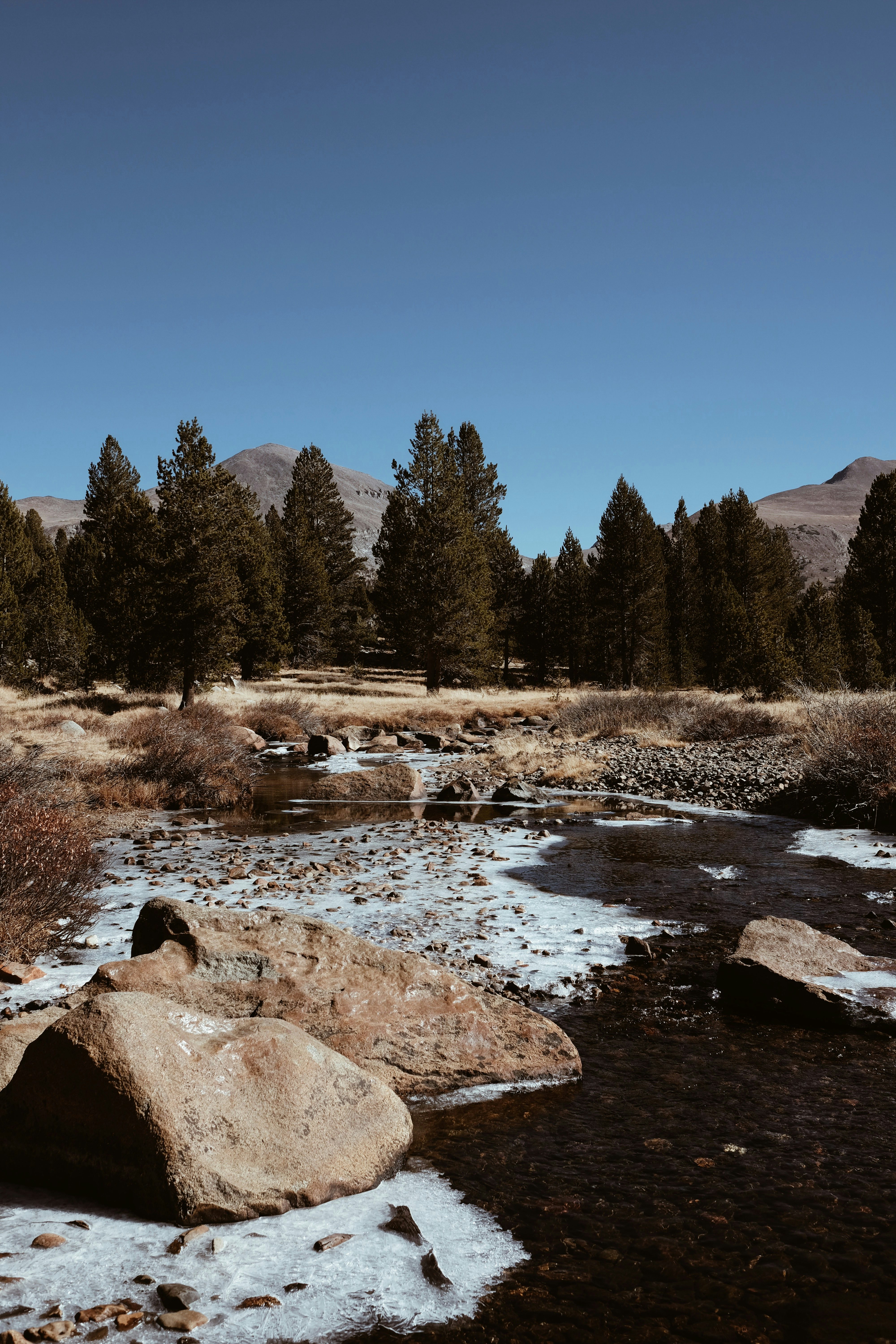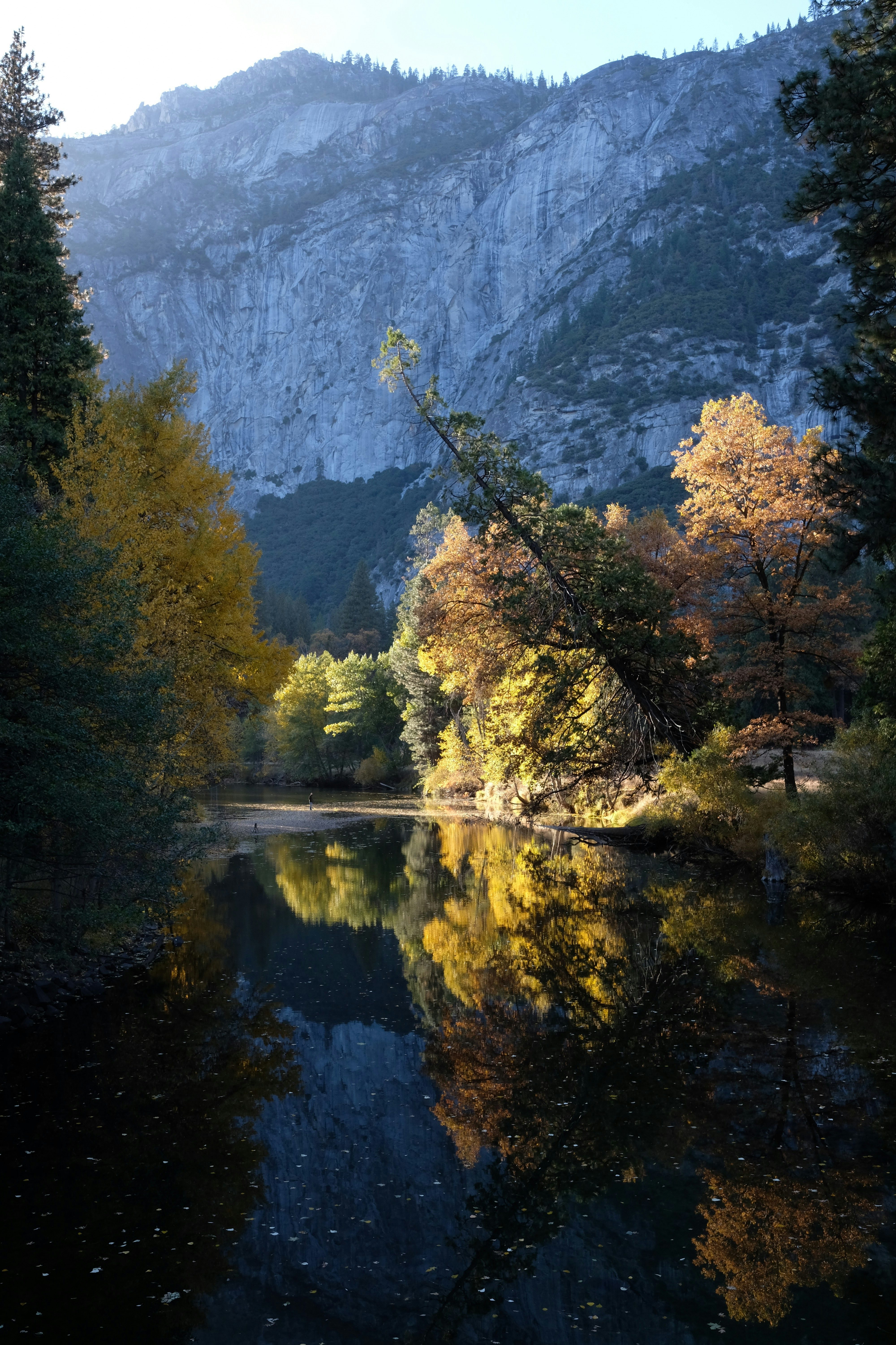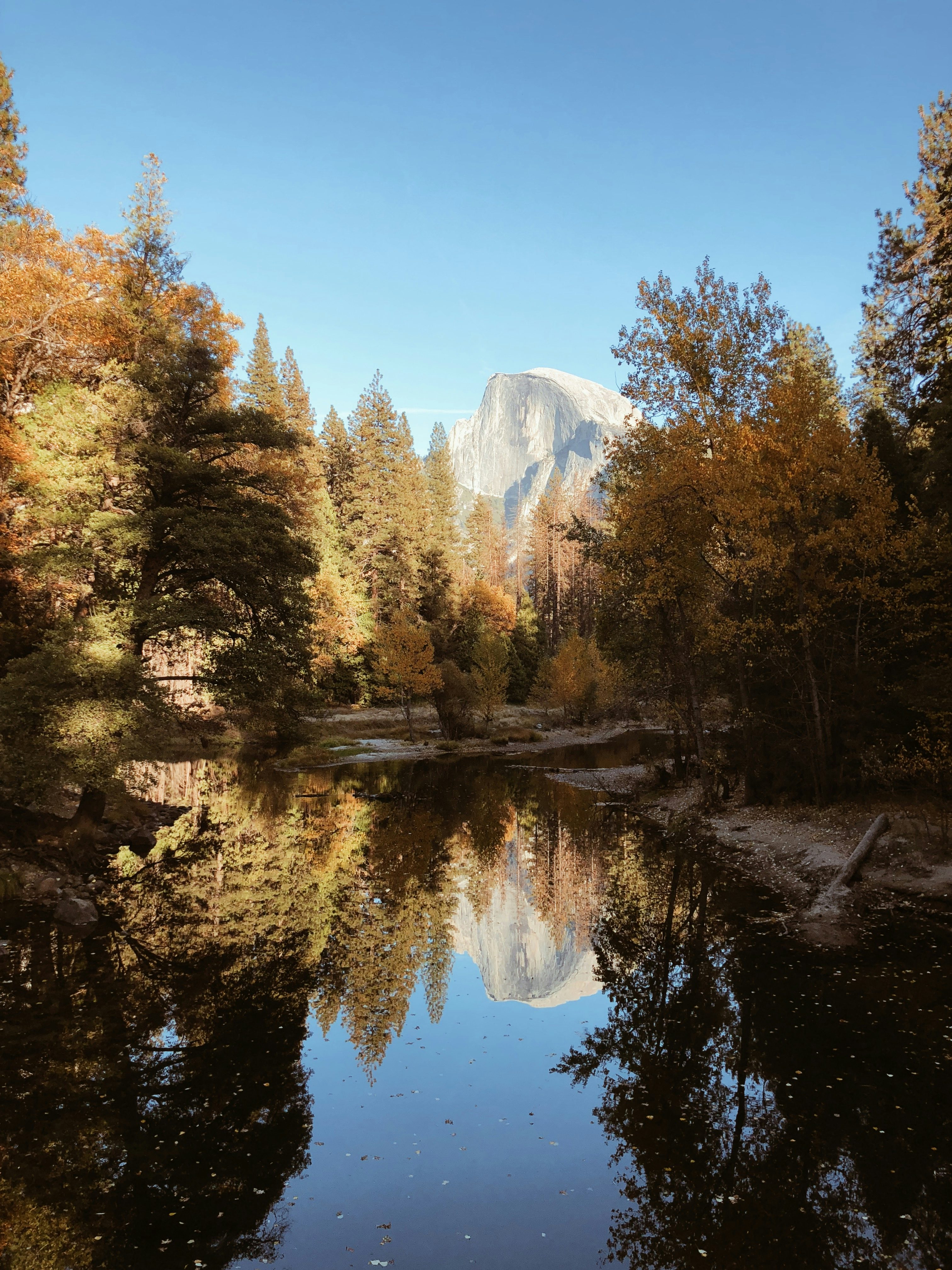 Ansonsten bekam ich als Autofahrerin tatsächlich weniger vom Park mit als mein Freund, der als Beifahrer die hohen Berge, tiefen Schluchten, Nadelwälder und Eisbäche ausgiebig bestaunen konnte. Ich genoß dafür die kurvenreiche Straße durch bunte Laubwälder, dabei hörten wir Indie Musik und mir fehlte nur noch das Holzfällerhemd zu meinem Glück. Besonders schön war dann die Einfahrt in das Yosemite Village, was unten im Tal gelegen ist und durch das wunderschöne Flüsse fließen und Wasserfälle strömen – die Pizza schmeckte vor dem Kamin mit Weihnachtsbaum besonders gut und ich bin im siebten Himmel: Ich habe den Yosemite Park überlebt – und das ohne Bärenangriff oder Sturz in die Tiefe.