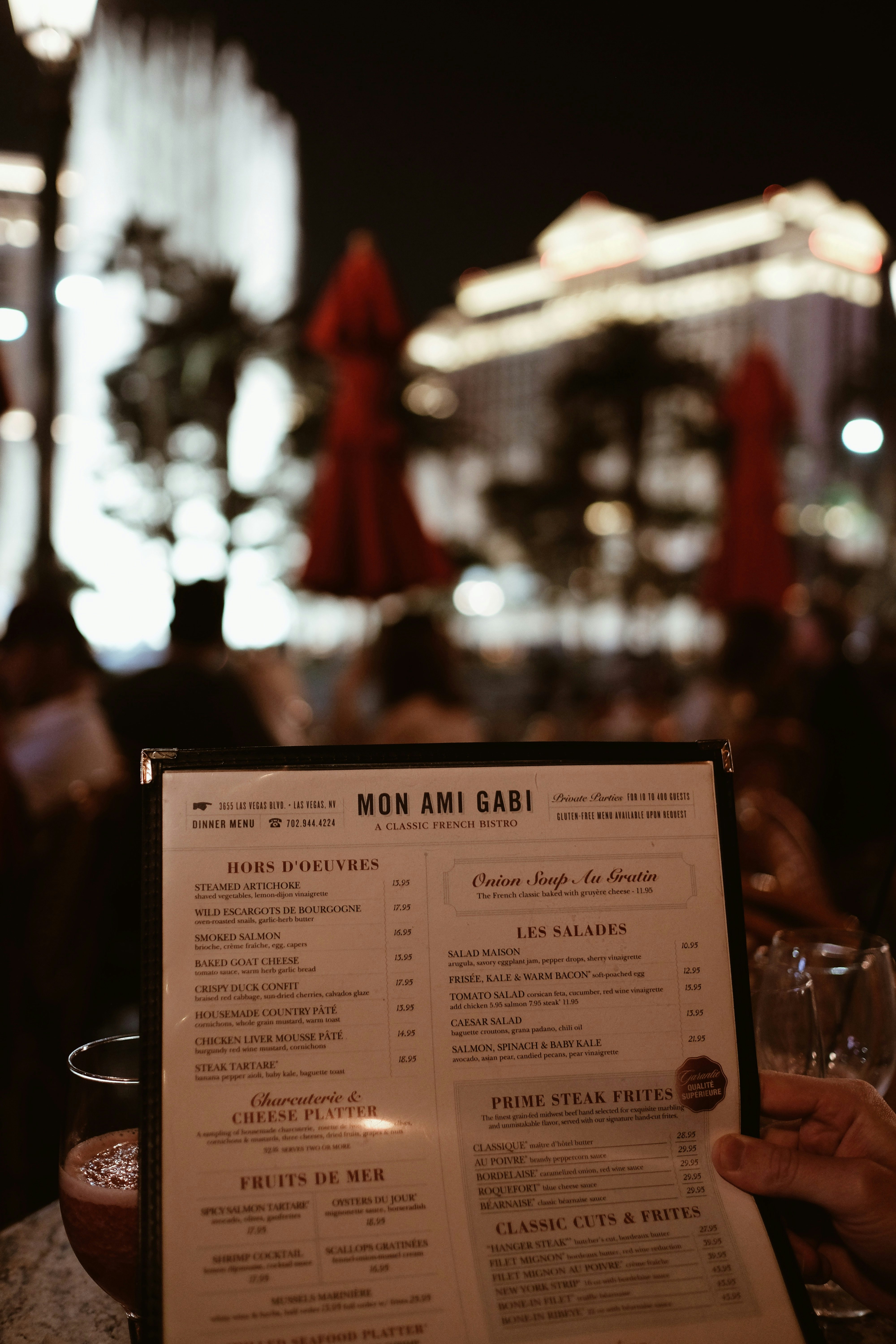 Auf den ersten Blick scheint es schier eine unmögliche Suche nach der Nadel im Heuhaufen, aber nach nur ein paar Minuten haben wir beide, unabhängig voneinander, das gleiche Restaurant ausgesucht – und so ist es beschlossene Sache: Wir gehen zu Mon Ami Gabi unter dem (Nachbau des) Pariser Eiffelturms. Und auf einmal ist Las Vegas gar nicht mehr so schlimm. Umgeben von Paaren sitzen wir auf einer kleinen Terrasse in der angenehm warmen Nacht, schauen auf das gegenüberliegende Bellagio und genießen die berühmten Fontänen mit dem Soundtrack „Singing in the Rain“. Dazu essen wir Artischocke, Entenbrust und Steak mit den köstlichsten Pommes, die wir in ganz Amerika verspeist haben – und das waren viele, glaubt mir – und trinken Erdbeer-Daiquiris. Das Leben könnte definitiv schlimmer sein.
