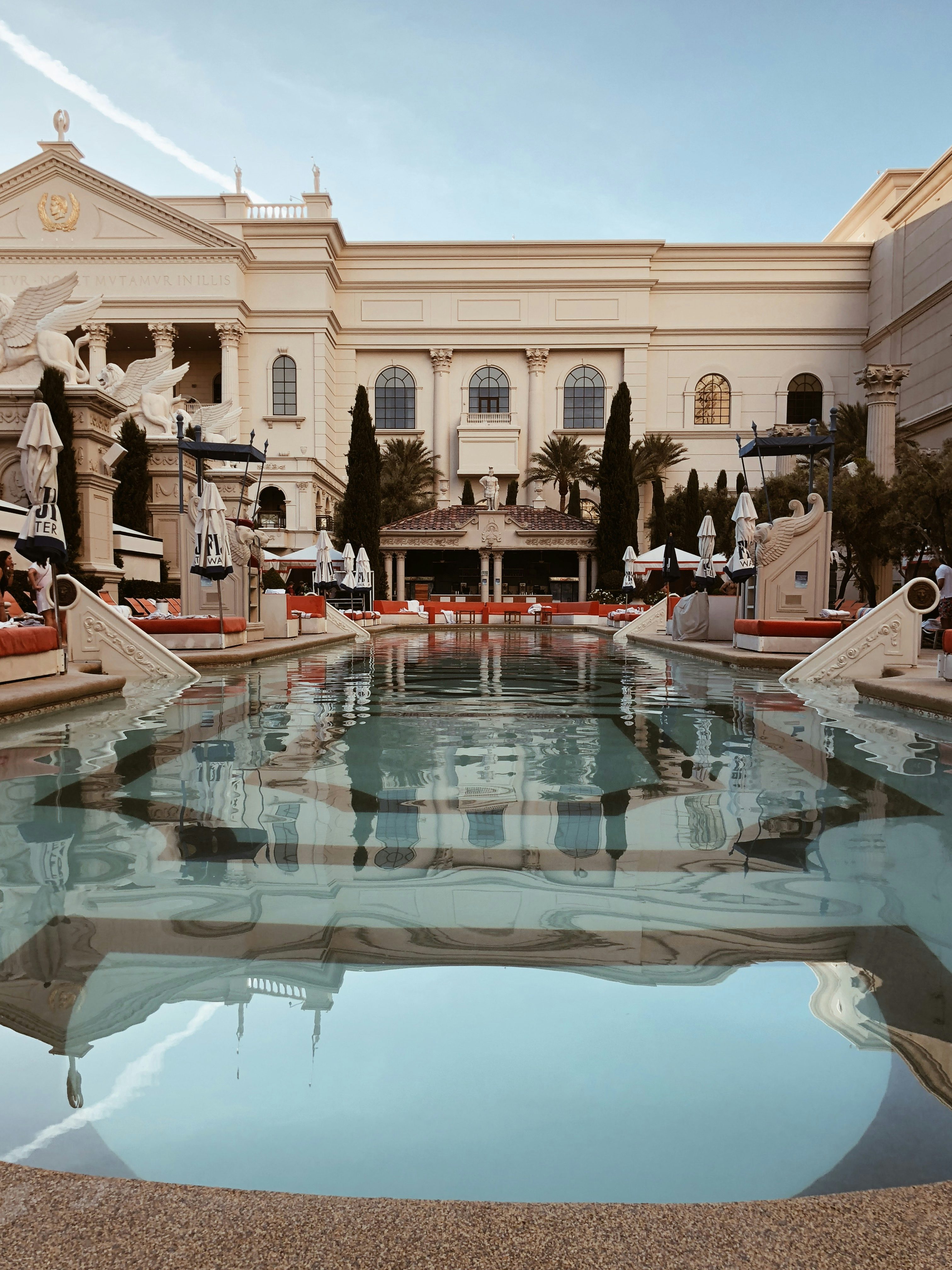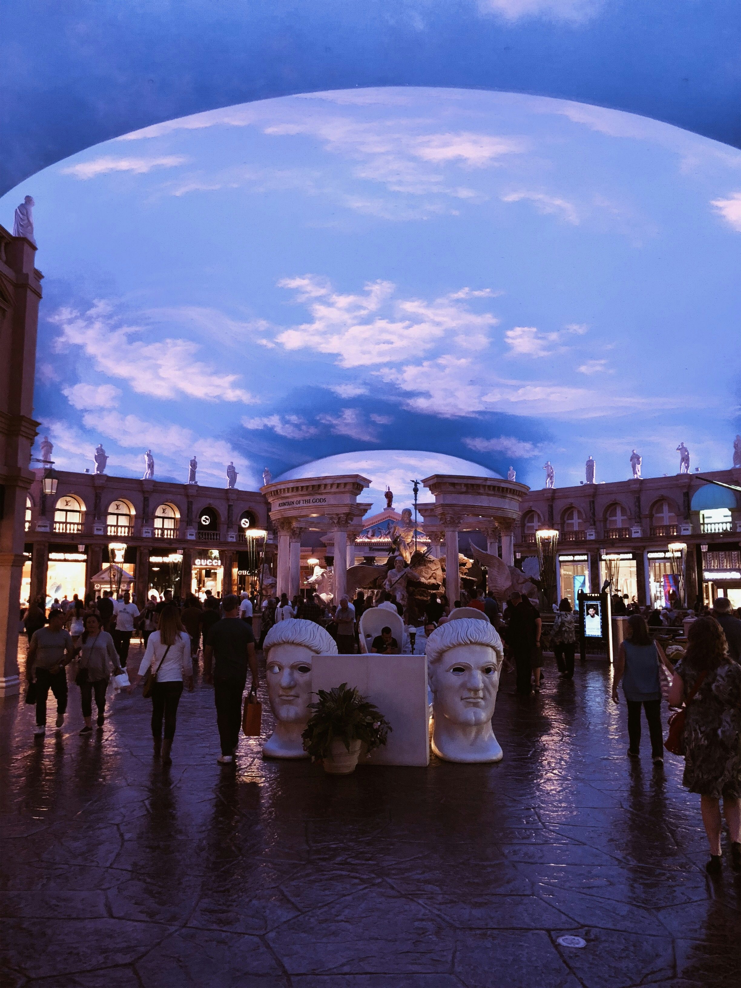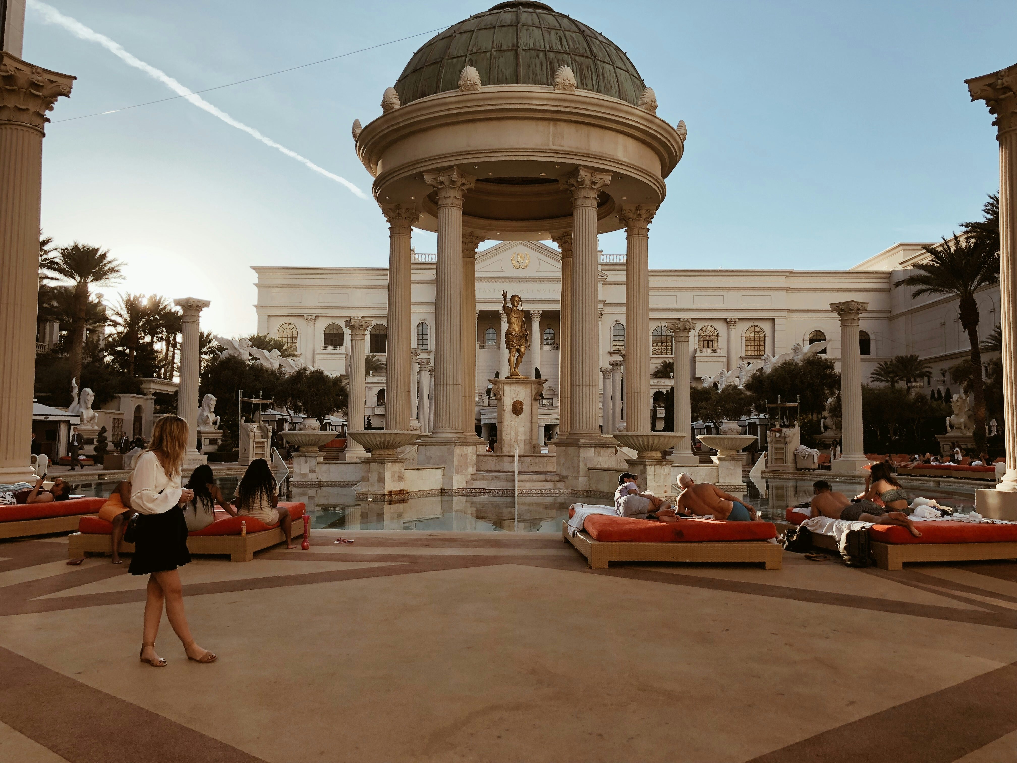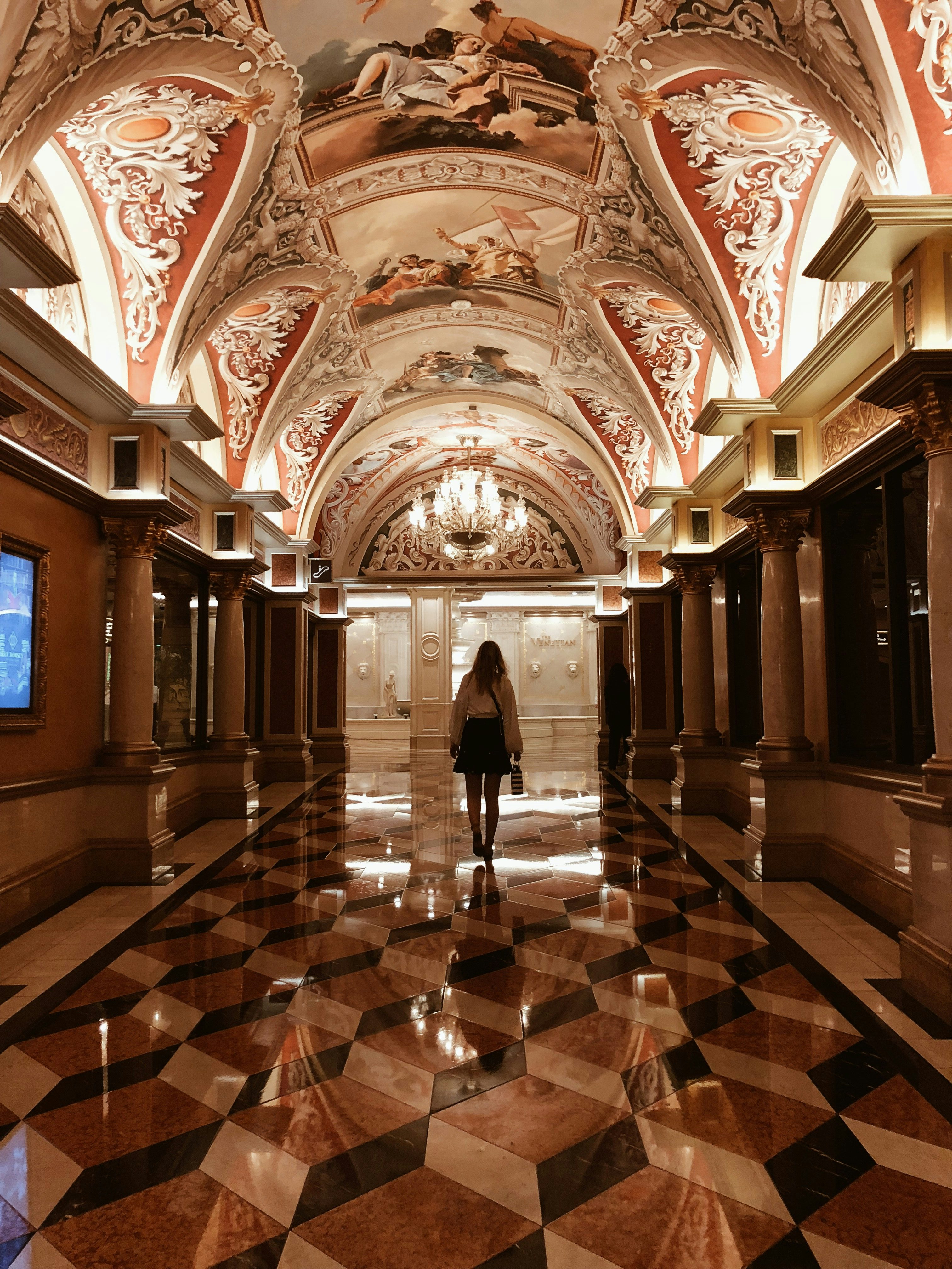 Kein Wunder, denn die großen Kasino Hotels wie das Mirage, Caesars Palace, Hardrock Hotel, Treasure Island, Wynn und wie sie noch so alle heißen, sind im Grunde gar keine Hotels, sondern Städte. Von unserem Hotelzimmer bis zu unserem Auto im Parkhaus mussten wir locker 20 Minuten laufen – und das ist nicht die weiteste Strecke, die man innerhalb des gleichen Hotels zurücklegen kann. Das Ziel dieser riesigen Räume: Gäste sollen das Kasino auf keinen Fall verlassen. Und man hält sie mit eigenen Shoppingmalls, Food Courts, mehreren Kasinos und Automatenbereichen, Pools und Sportbars quasi gefangen. Es gibt tatsächlich nur sehr wenige Ausgänge und die sind auch noch schlecht ausgeschildert, die Gänge so verwirrend gestaltet, dass man sich gut und gerne mal verläuft und mit aufgemaltem Himmel an der Decke wird einem auch noch das Draußen-Gefühl künstlich vorgespielt.