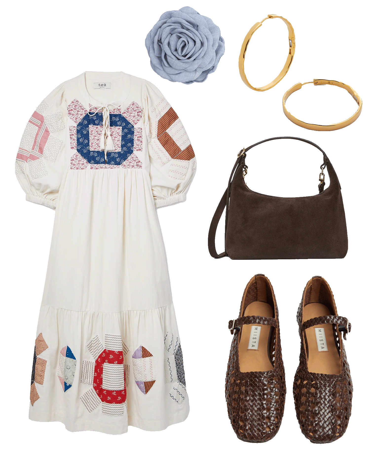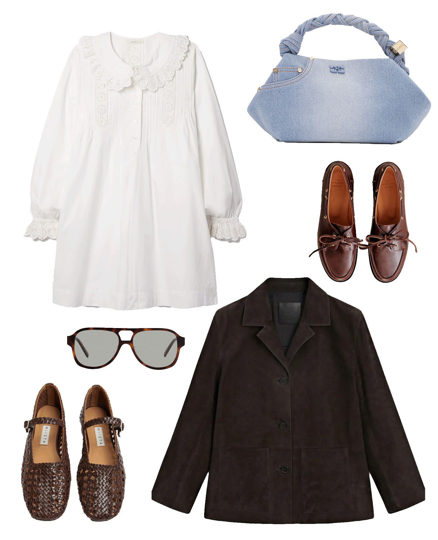 Kleid / Blazer (similar) / Tasche / Ballerinas / Boot Schuhe / Sonnenbrille